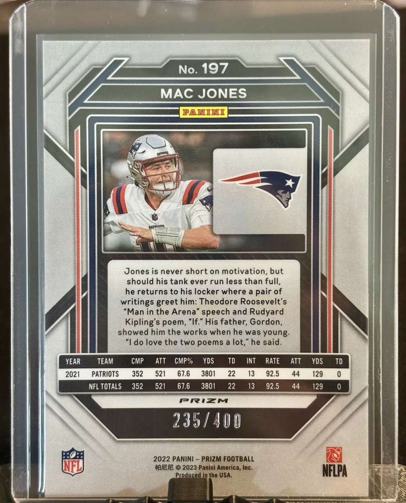 Elevate your collection with the 2022 Panini Prizm Pandora Prizm card featuring the talented Mac Jones. As part of the coveted 2022 Panini Prizm - Pandora Prizm set, this card is numbered #197 and showcases Jones in his New England Patriots colors. With a limited release of only 400 pieces, this serial-numbered gem is a must-have for NFL enthusiasts and collectors alike. Crafted by Panini America, Inc., the card reflects the excellence of the National Football League's 2022 season. The Pandora Prizm variety adds a unique parallel brilliance to the card's appearance, making it stand out in any display. An original piece, this sports trading card captures the spirit of the game and is a tribute to one of football's rising stars.