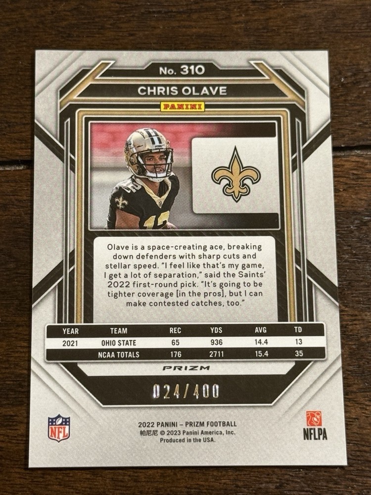 The 2022 Panini Prizm trading card features rookie player Chris Olave from the New Orleans Saints of the National Football League (NFL). This particular card is part of the Pandora Prizm parallel variety with a limited print run of 400 copies, making it a rare find for collectors. It is serial numbered as #310 in the base set, and it showcases Olave in his rookie season of 2022, making it a desirable addition to any sports trading card collection.