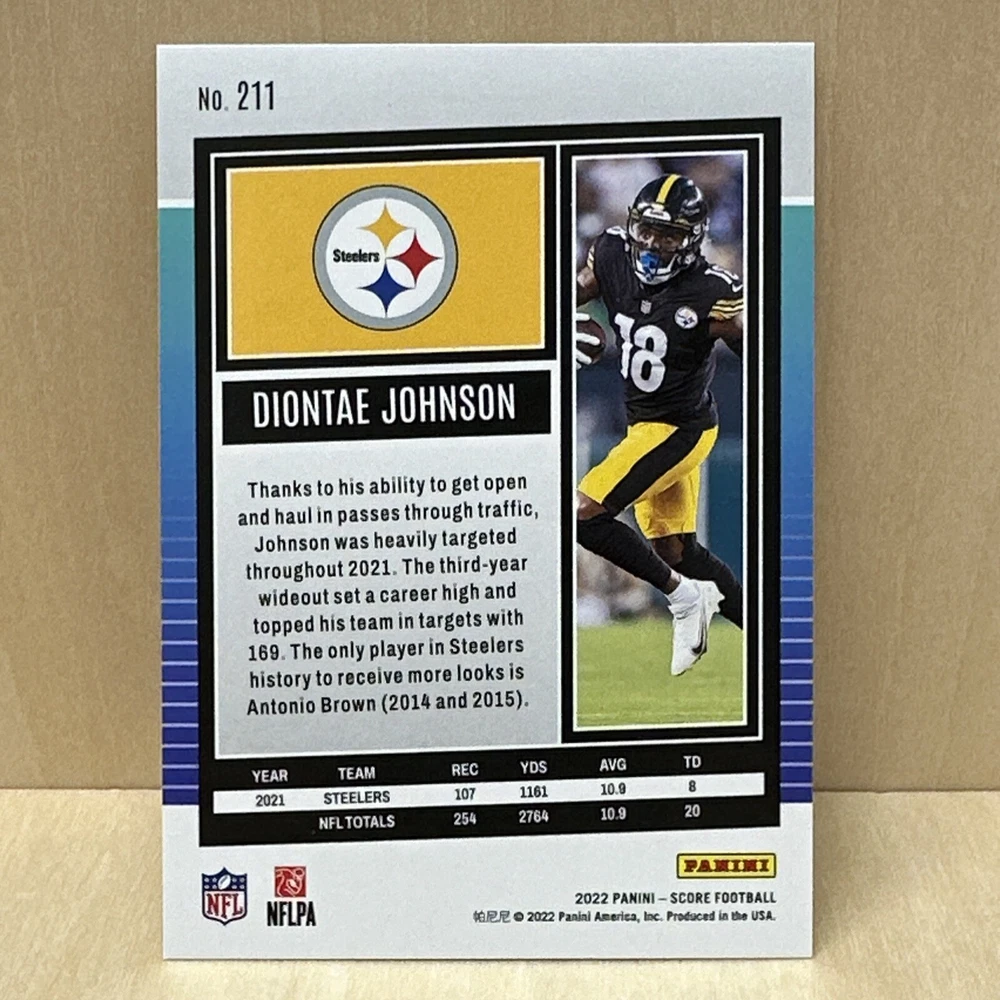 This 2022 Panini Score Gold trading card features Diontae Johnson of the Pittsburgh Steelers. The card is made of high-quality card stock and is an original licensed product. It is part of the 2022 Score set and has a card number of 211. The card is standard size and has a gold parallel/variety. It is perfect for collectors of National Football League (NFL) memorabilia and sports trading cards. Get your hands on this rare and valuable card today!