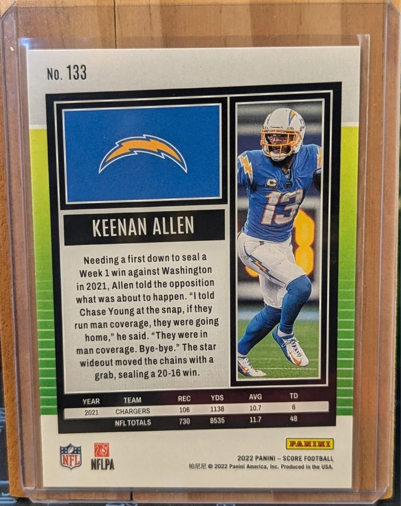 Year Manufactured: 2022 Features: Base Set Manufacturer: Panini Player/Athlete: Keenan Allen Type: Sports Trading Card Set: 2022 Score Language: English Team: Chicago Bears, Los Angeles Chargers Card Size: Standard Vintage: No Season: 2022 Sport: Football Autographed: No Card Number: 133 Country/Region of Manufacture: United States League: National Football League (NFL) Original/Licensed Reprint: Original