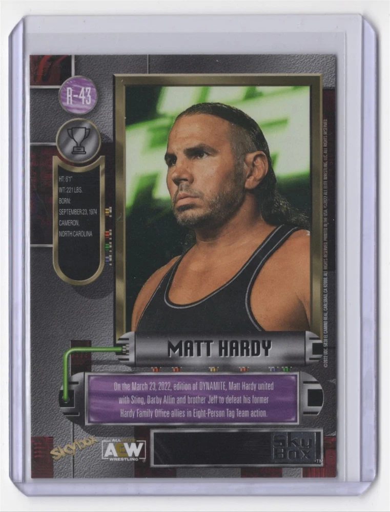 Set: SkyBox Metal Universe AEW 97-98 Retro Sport: Wrestling Stage: Unspecified Player/Athlete: Matt Hardy Team: Unspecified Season: 2022 Card Name: 2022 SkyBox Metal Universe AEW 97-98 Retro Matt Hardy #R-43 Card Size: 4" x 3" Game: Unspecified Vintage: No Type: Unspecified Graded: No Character: Matt Hardy Year Manufactured: 2022 Card Number: R-43 Original/Licensed Reprint: Original Franchise: Wrestling Autographed: No