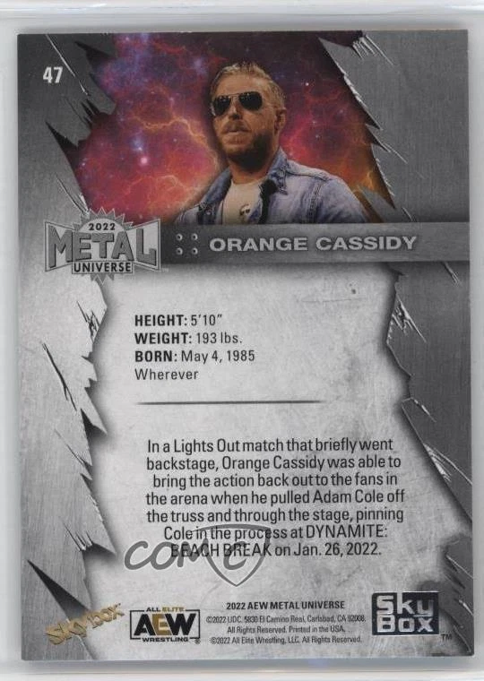 Franchise: N/A Team: N/A Manufacturer: Upper Deck Card Name: Orange Cassidy Professional Grader: None Type: Sports Trading Card Athlete: Orange Cassidy Card Number: 47 Product: Single-Parallel Parallel/Variety: Blue Spectrum Sport: Wrestling Card Manufacturer: Upper Deck Player: Orange Cassidy Year Manufactured: 2022 Graded: No Set: 2022 Skybox Metal Universe AEW All Elite Wrestling - [Base] - Blu Year: 2022 Original/Reprint: Original Season: 2022 Grade: Ungraded Player/Athlete: Orange Cassidy