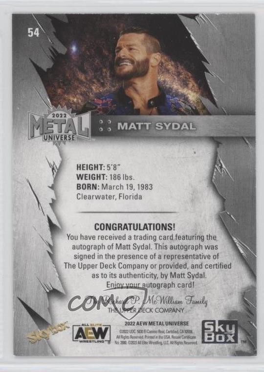 2022 Skybox Metal Universe AEW All Elite Wrestling - [Base] - Silver Autographs #54 Matt Sydal - Wrestling Card - Featuring Matt Sydal Search for more: 2022 Skybox Metal Universe AEW All Elite Wrestling Search for more: 2022 Skybox Metal Universe AEW All Elite Wrestling - [Base] - Silver Autographs View all of our Listings Auctions Buy It Now About Us Located in the beautiful Pacific Northwest, COMC (Check Out My Cards) is the world's largest consignment service for trading card singles. More than 10,000 people have used our consignment service to list over 50 million trading cards. Find out how we can help you consign your items on eBay by contacting us through eBay messaging. COMC -- "The Safe & Easy Way to Buy & Sell" Representative Image - Select Specific Item above to see image of actual item Representative Image - Select Specific Item above to see image of actual item Raw Condition for Modern Cards Unless otherwise noted, raw modern cards are listed in Near Mint-Mint condition or better. A NM-MT card appears to be Mint at first glance, but upon closer inspection, may exhibit some of the following: minor print defects (e.g. roller marks, print line, dimple), minor scratches, slight edge wear, and slight corner wear. Centering is clearly visible in the images provided and does not factor into our condition assessment. Raw Condition for Vintage Cards Unless otherwise noted, raw vintage cards are listed in Excellent condition or better. An EX card may exhibit some of the following: minor rounding of corners, surface wear, print defects, light scratches, and slight edge wear/chipping. Centering is clearly visible in the images provided and does not factor into our condition assessment. Domestic Shipping Combined shipping for multiple items is available. To receive combined shipping, please ensure all desired items are in your eBay shopping cart before proceeding to checkout. eBay limits orders to 40 items per order. We automatically combine multiple orders placed on the same day. If you place multiple orders on the same day, please contact us to request a refund of applicable shipping costs. Signature confirmation may be required on invoices over $400. All cards are protected and shipped securely. International Shipping COMC offers eBay's International Shipping (EIS) for international orders under $2,500* (see country exceptions below). All duties and import fees are paid at checkout; in the rare event that there are additional import fees upon delivery, these are borne by the buyer. EIS packages route through a shipping hub in Erlanger, KY before shipping to their final destination. Please note that EIS does not allow for combined shipments. The shipping rates are determined by eBay and cannot be adjusted. *Maximum sale price exceptions: Colombia, Kuwait ($2,000); Taiwan ($1,539); Chile, Costa Rica, Guatemala, Honduras, Trinidad and Tobago ($1,000); Antigua and Barbuda, Aruba, Belize, Dominica, Grenada, Philippines, Saint Kitts and Nevis, Saint Lucia, Montserrat, Turks and Caicos Islands ($500); Dominican Republic, El Salvador ($200). Please request a shipping quote through eBay messaging for orders that exceed the maximum sale price supported by eBay's International Shipping. You will be responsible for all duties and import fees for international orders shipped outside the EIS. All cards are protected and shipped securely. Payment COMC does not accept offers on our cards through our eBay storefront. COMC utilizes eBay’s managed payments system. If you are experiencing difficulties making a payment, please contact eBay for assistance. Return Policy Returns are only accepted on the rare occasion the item is not as described. If you are making a return, please initiate the return process through eBay so a mailing label can be provided for you. Prior to listing, our expert team carefully assessed this item to represent it accurately. Please review the description and high-definition images prior to purchasing to ensure this item meets your satisfaction. We welcome you to contact us if you have further questions about this item. Trust and Integrity COMC carefully assesses each item consigned to us to prevent fraudulent items from entering the marketplace. If you believe an item offered on COMC may be fraudulent, please contact us with details so we can investigate the issue. Items we determine are outside our supported items policy may be removed. Last Modified: 6/4/2025 3:38:08 PM PDT