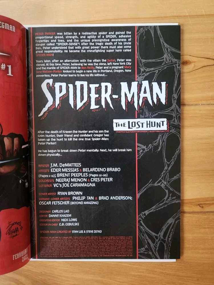 Series Title: Spider-Man: the Lost Hunt Publisher: Marvel Comics Cover Artist: Oliver Fetscher Variant Type: Cover Variant - C Language: English Inscribed: No Grade: 9.6 Near Mint+ Personalized: No Issue Number: 2 Signed: No Type: Comic Book Genre: Superheroes Artist/Writer: J.M. Dematties, Ryan Brown Style: Color Vintage: No Format: Single Issue Character: Spider-Man (Peter Parker) Publication Year: 2022 Country/Region of Manufacture: United States Tradition: US Comics Era: Modern Age (1992-Now) Features: First Printing, Boarded Universe: Marvel (MCU) Intended Audience: General Audience Unit of Sale: Single Unit Superhero Team: Avengers
