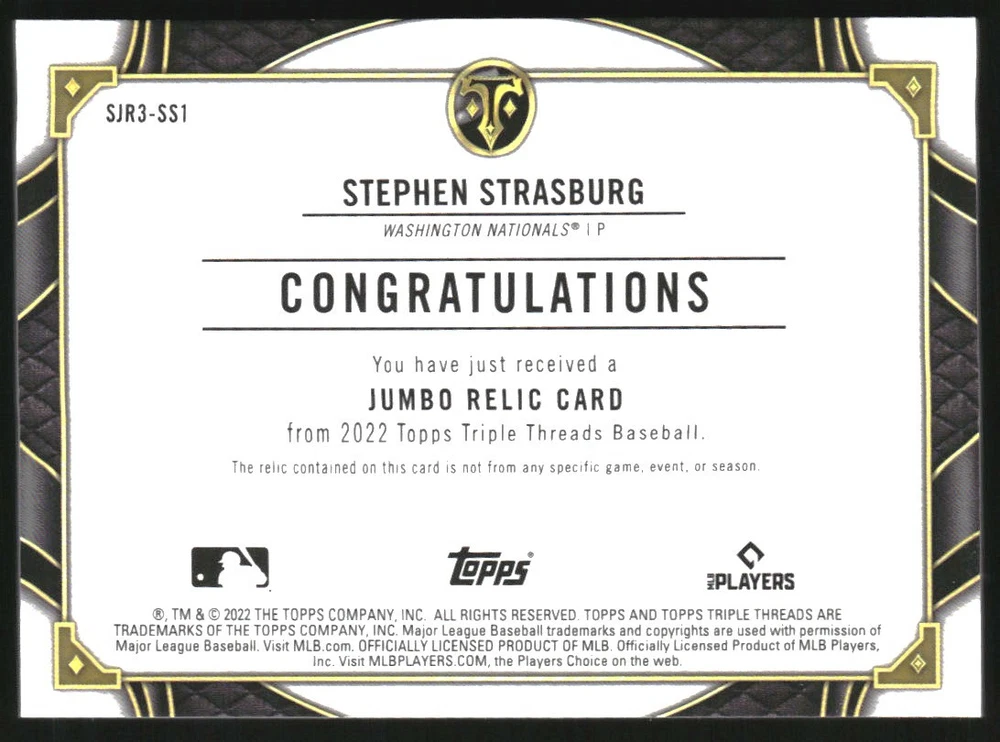 2022 T Triple Threads Single Jumbo Relics #SJR3SS1 Stephen Strasburg Jersey /48 Front Back Sport: Baseball Set: 2022 Topps Triple Threads Single Jumbo Relics Year: 2022 Item#: SJR3SS1 Player: Stephen Strasburg Team: Washington Nationals Attributes: Memorabilia, Serial Numbered Brand: Topps Triple Threads Manufacturer: Topps Co. Grading Company: Raw Grade SetType: Insert Item Condition: Near Mint/Mint 2014 Beckett Collectibles, LLC. All Rights Reserved Powered by: Thank you for choosing Burbank Sportscards, the sports cards superstore. We offer a large selection of singles across all sports. Visit our ebay store to view all our items available. Our Shipping Policy We offer Free Standard Shipping to all Domestic customers. Options for Expedited shipping are also available at checkout. For our international customers, shipping is $9.99 for the first item, and $0.25 for each additional item. Note to all customers: To qualify for combines shipping, we ask our customers to add items into the shopping cart. Please note, we do not combine orders that are placed separately. Our Service: Generally, our turnaround is super quick as we process and send out orders same day payment is received. Stock Availability: We do our best to ensure all items are in stock; however, in case of the rare stock out, the customer will have the option for a replacement card, or we will process a refund so the order is not held up. Our Images: Many of our images are stock photos from Beckett archives. They are a representation of the actual card you would receive. If you have any questions regarding the item you're interested in, please feel free to ask (serial numbers and relic pieces may vary) Moreover, in a case of a wrong or defective photo, please notify us, so we can adjust it. Other FAQ's: -When buying multiple cards, do you top load each item? No; however, we do try to insure all items are shipped securely. If you wish to have all of your cards top loaded it is a paid service and can be arranged. Please email for more details. For other questions, please feel free to ask. Thank you.