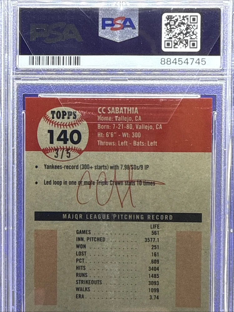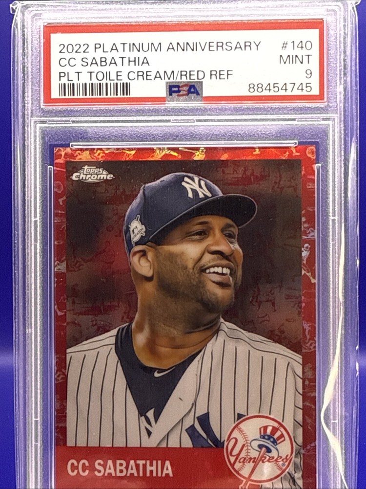 This is a 2022 Topps Chrome Platinum Anniversary trading card featuring CC Sabathia of the New York Yankees. The card is a Platinum Toile Cream And Red Refractor parallel, with a print run of 5. It is serial numbered 3/5, PSA graded 9, and is a 2025 Hall of Fame inductee collectible. The card is made of 55 Pt. card stock and was manufactured in the United States by Topps.