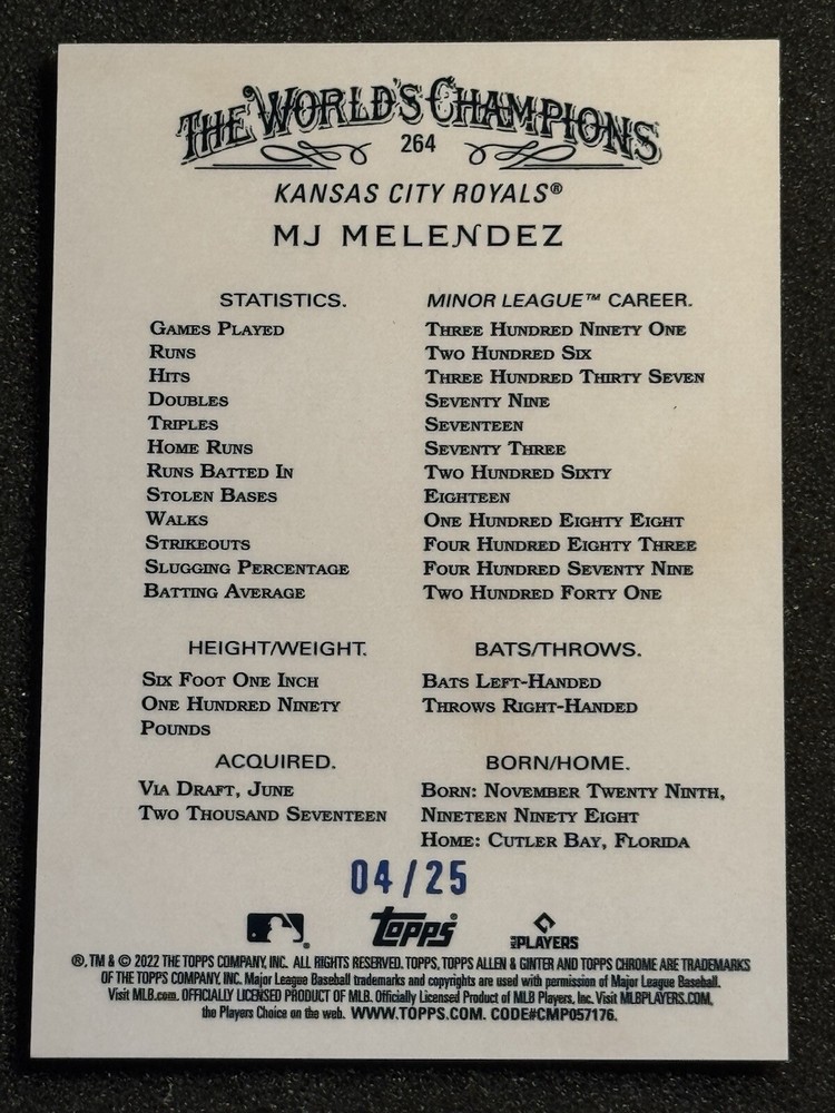 Sport:BaseballParallel/Variety:Green RefractorFeatures:Rookie, Serial Numbered, Base Set, Parallel/VarietyCard Number:264Team:Kansas City RoyalsPlayer/Athlete:MJ MelendezPrint Run:99Type:Sports Trading CardSeason:2022Set:2022 Topps Allen & Ginter ChromeLeague:Major League Baseball (MLB)Manufacturer:Topps
