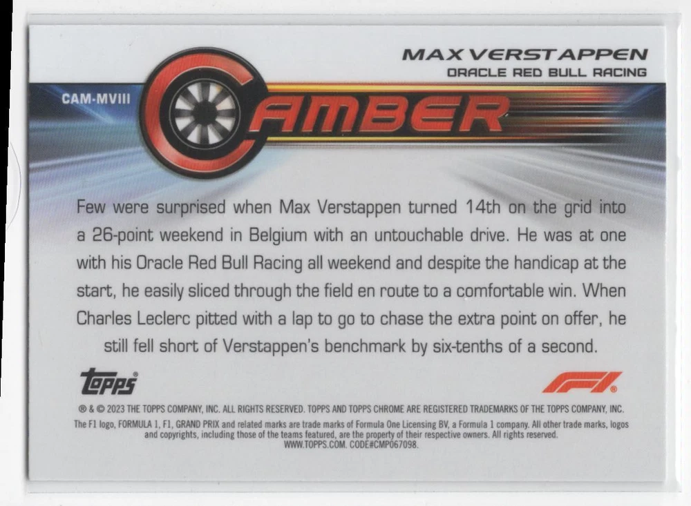 About Me Other Listings Feedback Add to Favorites Contact Me Striking Cards 901 2022 Topps Chrome Formula 1 Camber Max Verstappen Oracle Red Bull Racing No stock photo / These are real scans or pictures Details Description: Max Verstappen Category: Racing Year: 2022 Product: Topps Chrome Formula 1 Camber Team: Oracle Red Bull Racing Card Number: CAM-MVIII Dimensions: 3½" x 2½" SKU: RA B0001 R01 B (197) Listing By Kronocard trading cards software v2.7.0.1