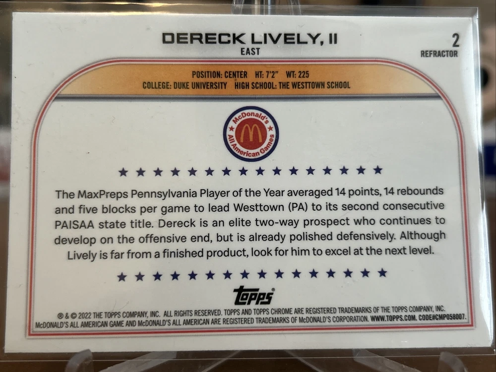 Be sure to see these pulled pack fresh on YouTube @bluecollarbreaks. make sure to like and subscribe. This is a rare and highly sought-after sports trading card featuring Dereck Lively, II, from The Westtown School Moose. The card is from the 2022 Topps Chrome McDonald's All American set and is a limited edition, exclusive collectors item. It is a 1st Edition memorabilia card with the card number 2 and is perfect for any NBA or National Collegiate Athletic Association (NCAA) fan. The card is ungraded, but the quality of the card is near mint or better. It is manufactured by Topps and is a part of the 2022 season. This card is a great addition to any sports trading card collection and is sure to impress.
