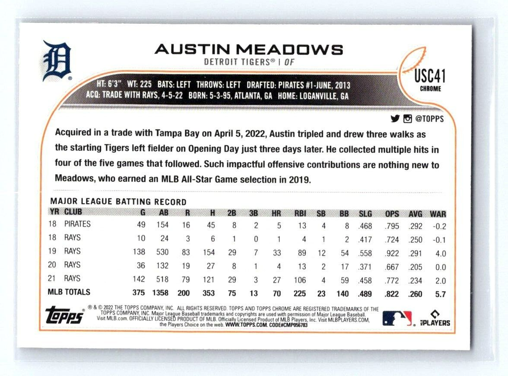 2022 Topps Chrome Update Pink Wave Austin Meadows #USC41 Detroit Tigers Don?t Miss Your Chance to get this Great Card Today! Photos are not "stock" Photos are of the Actual Card that you will Receive. (if listing has a Quantity of more than 1 then Common photo may be used) JEm Mint Trading