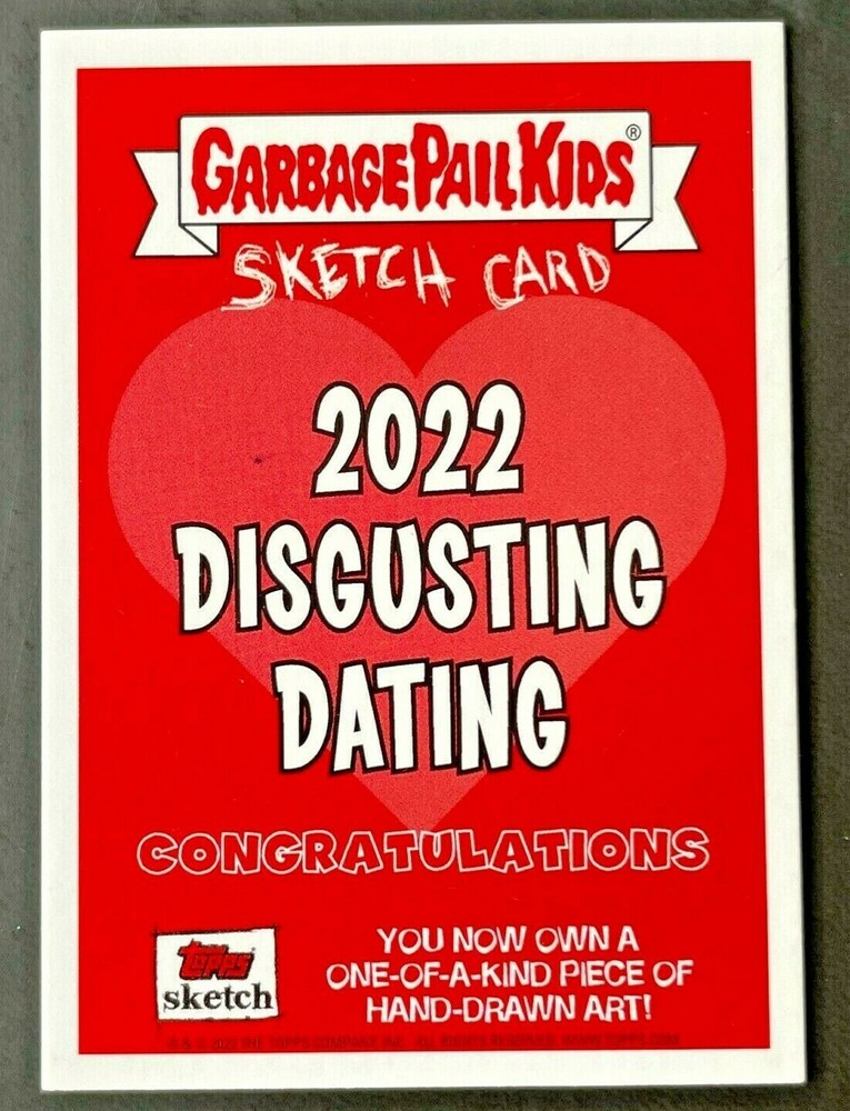 This is an original 1 of a kind sketch card that is hand sketched and officially released by Topps! Very rare and there will never be another one! Artist: El Smetcho Type: Artist Sketch Card Release Year: 2022 Series Release: Valentine's Day Disgusting Dating Character: Grim Jim / Beth Death Media Used: Pencil, Marker and Watercolor and signed by the artist in blue marker Special Notes: Photo is showing the exact sketch that you will receive! Condition: Minty, placed in a sleeve once pulled.