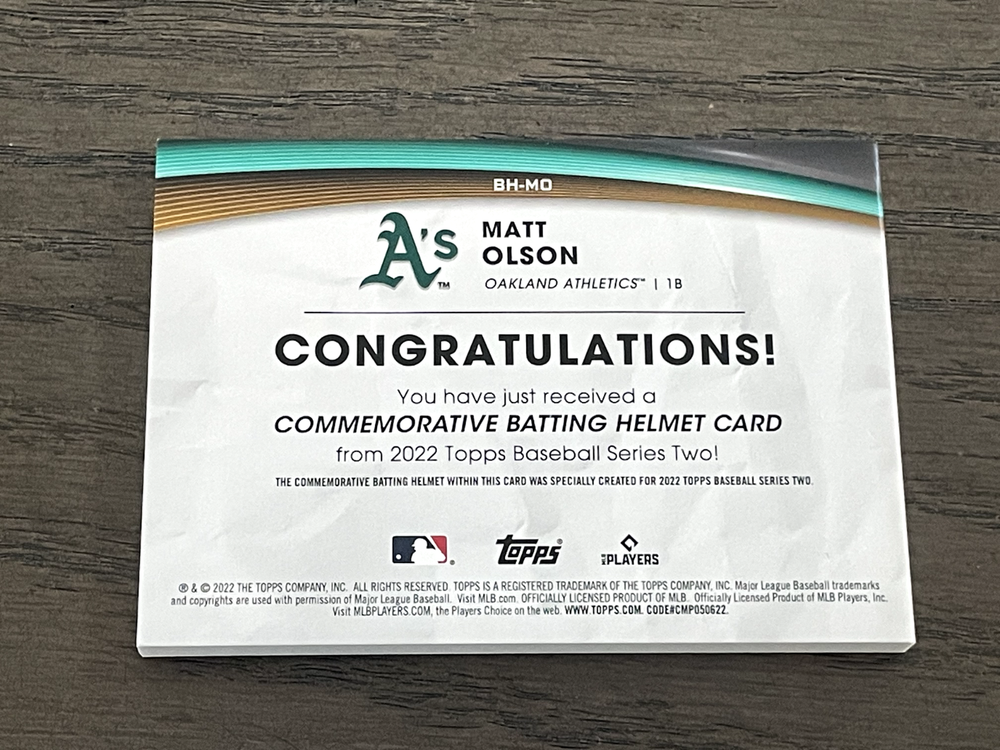 2022 Topps Batting Helmet Commemorative Relic Matt Olson #BH-MO Athletics You are bidding on the exact Card in the photo. Please take a close look at the photos to determine the condition of the Card for yourself. Please check out my eBay store for more items: Save on shipping with multiple items are either purchased or won! Combined shipping available when multiple items are purchased in a single transaction. Combined shipping is calculated as the highest shipping cost + $1 per additional item. When purchasing multiple items, please place all items in cart before paying. When purchasing multiple auction items please wait until final invoice is sent. If you have a question, please send me a message. Thanks for looking!!!