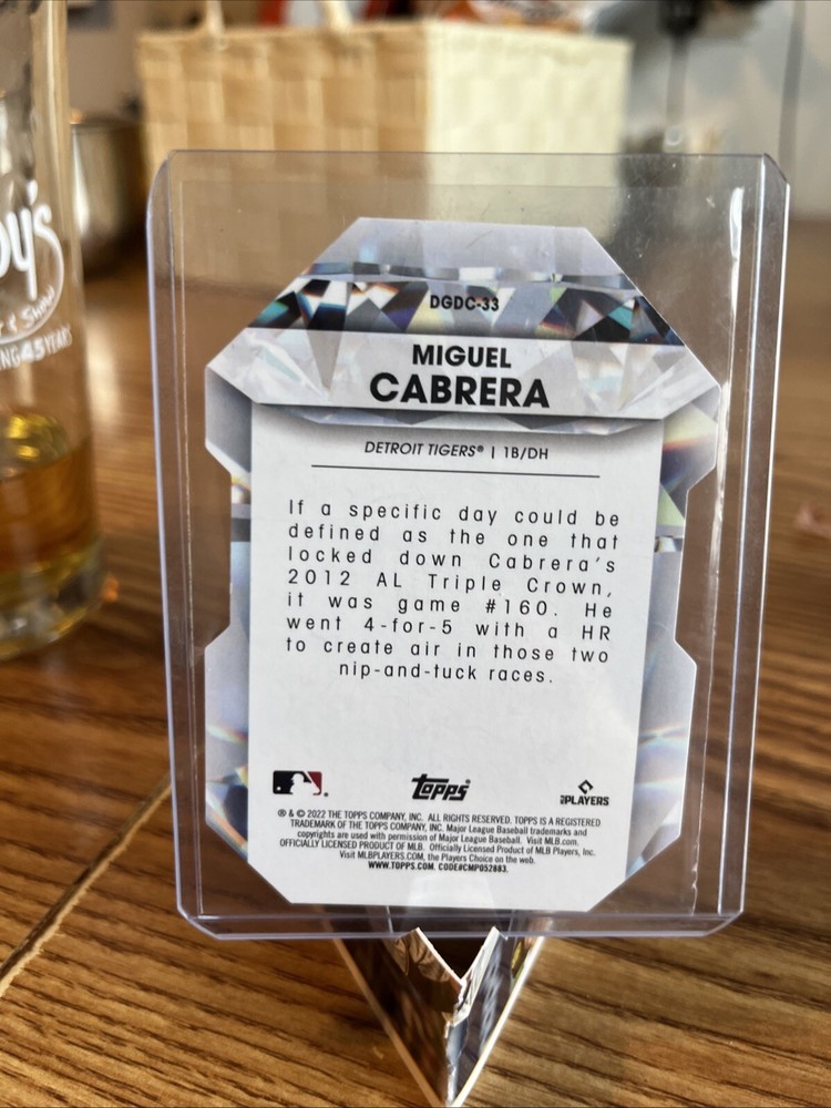 The 2022 Topps Series 2 trading card features a Diamond Greats Die-Cut card of Miguel Cabrera, identified by the card number DGDC-33. This particular card showcases Cabrera, a prominent baseball player, in a die-cut design that adds a unique visual appeal to the collectible. The card's near mint or better condition makes it highly desirable for collectors looking to add a premium piece to their sports trading card collection.