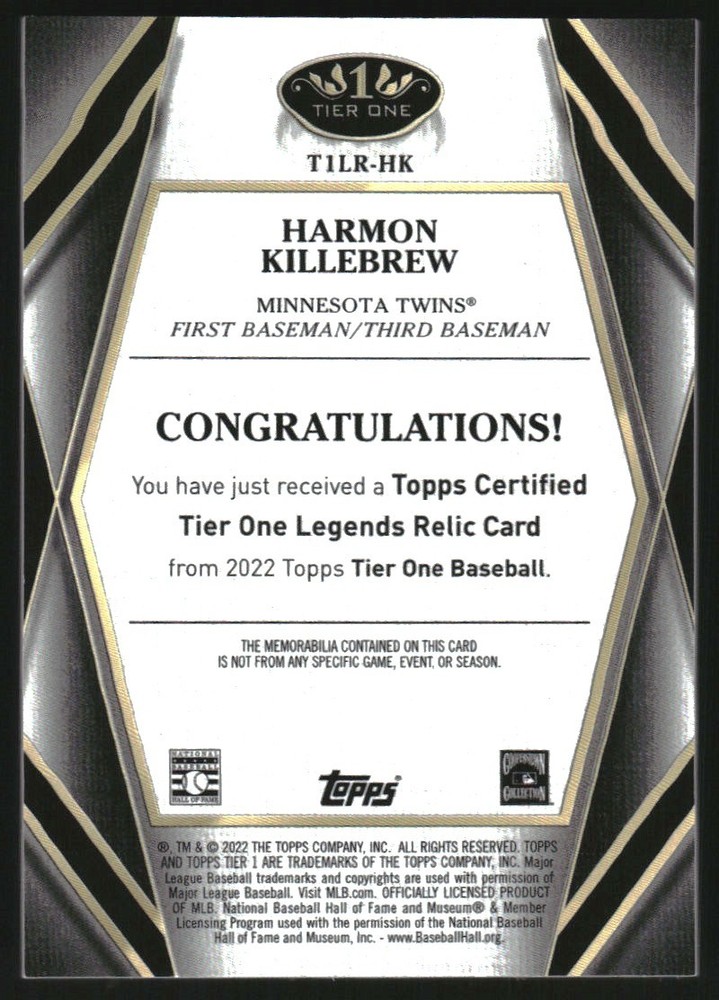 2022 Topps Tier One Legend Relics #T1LRHK Harmon Killebrew Jersey /99 Front Back Sport: Baseball Set: 2022 Topps Tier One Legend Relics Year: 2022 Item#: T1LRHK Player: Harmon Killebrew Team: Minnesota Twins Attributes: Memorabilia, Serial Numbered Brand: Topps Tier One Manufacturer: Topps Co. Grading Company: Raw Grade SetType: Insert Item Condition: Near Mint/Mint 2014 Beckett Collectibles, LLC. All Rights Reserved Powered by: Thank you for choosing Burbank Sportscards, the sports cards superstore. We offer a large selection of singles across all sports. Visit our ebay store to view all our items available. Our Shipping Policy We offer Free Standard Shipping to all Domestic customers. Options for Expedited shipping are also available at checkout. For our international customers, shipping is $9.99 for the first item, and $0.25 for each additional item. Note to all customers: To qualify for combines shipping, we ask our customers to add items into the shopping cart. Please note, we do not combine orders that are placed separately. Our Service: Generally, our turnaround is super quick as we process and send out orders same day payment is received. Stock Availability: We do our best to ensure all items are in stock; however, in case of the rare stock out, the customer will have the option for a replacement card, or we will process a refund so the order is not held up. Our Images: Many of our images are stock photos from Beckett archives. They are a representation of the actual card you would receive. If you have any questions regarding the item you're interested in, please feel free to ask (serial numbers and relic pieces may vary) Moreover, in a case of a wrong or defective photo, please notify us, so we can adjust it. Other FAQ's: -When buying multiple cards, do you top load each item? No; however, we do try to insure all items are shipped securely. If you wish to have all of your cards top loaded it is a paid service and can be arranged. Please email for more details. For other questions, please feel free to ask. Thank you.