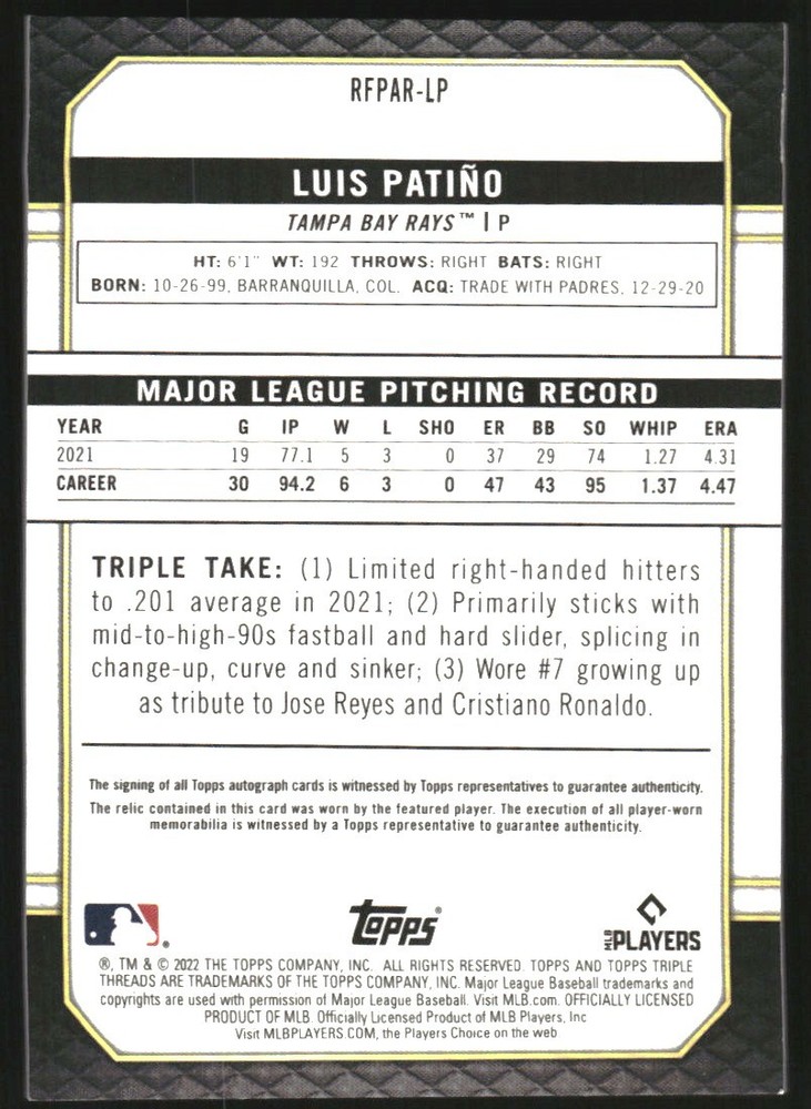 2022 Topps Triple Threads Onyx #RFPARLP Luis Patino Autograph Jersey /25 Front Back Sport: Baseball Set: 2022 Topps Triple Threads Onyx Year: 2022 Item#: RFPARLP Player: Luis Patino Team: Tampa Bay Rays Attributes: Autograph, Memorabilia, Serial Numbered Brand: Topps Triple Threads Manufacturer: Topps Co. Grading Company: Raw Grade SetType: Parallel Item Condition: Near Mint/Mint 2014 Beckett Collectibles, LLC. All Rights Reserved Powered by: Thank you for choosing Burbank Sportscards, the sports cards superstore. We offer a large selection of singles across all sports. Visit our ebay store to view all our items available. Our Shipping Policy We offer Free Standard Shipping to all Domestic customers. Options for Expedited shipping are also available at checkout. For our international customers, shipping is $9.99 for the first item, and $0.25 for each additional item. Note to all customers: To qualify for combines shipping, we ask our customers to add items into the shopping cart. Please note, we do not combine orders that are placed separately. Our Service: Generally, our turnaround is super quick as we process and send out orders same day payment is received. Stock Availability: We do our best to ensure all items are in stock; however, in case of the rare stock out, the customer will have the option for a replacement card, or we will process a refund so the order is not held up. Our Images: Many of our images are stock photos from Beckett archives. They are a representation of the actual card you would receive. If you have any questions regarding the item you're interested in, please feel free to ask (serial numbers and relic pieces may vary) Moreover, in a case of a wrong or defective photo, please notify us, so we can adjust it. Other FAQ's: -When buying multiple cards, do you top load each item? No; however, we do try to insure all items are shipped securely. If you wish to have all of your cards top loaded it is a paid service and can be arranged. Please email for more details. For other questions, please feel free to ask. Thank you.