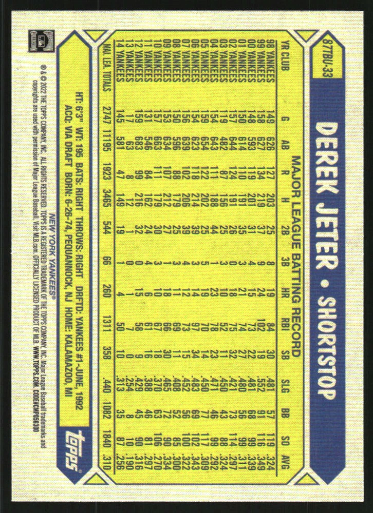 2022 Topps Update '87 Topps #87TBU33 Derek Jeter Front Back Sport: Baseball Set: 2022 Topps Update '87 Topps Year: 2022 Item#: 87TBU33 Player: Derek Jeter Team: New York Yankees Brand: Topps Update Manufacturer: Topps Co. Grading Company: Raw Grade SetType: Insert Item Condition: Near Mint/Mint 2014 Beckett Collectibles, LLC. All Rights Reserved Powered by: Thank you for choosing Burbank Sportscards, the sports cards superstore. We offer a large selection of singles across all sports. Visit our ebay store to view all our items available. Our Shipping Policy We offer Free Standard Shipping to all Domestic customers. Options for Expedited shipping are also available at checkout. For our international customers, shipping is $9.99 for the first item, and $0.25 for each additional item. Note to all customers: To qualify for combines shipping, we ask our customers to add items into the shopping cart. Please note, we do not combine orders that are placed separately. Our Service: Generally, our turnaround is super quick as we process and send out orders same day payment is received. Stock Availability: We do our best to ensure all items are in stock; however, in case of the rare stock out, the customer will have the option for a replacement card, or we will process a refund so the order is not held up. Our Images: Many of our images are stock photos from Beckett archives. They are a representation of the actual card you would receive. If you have any questions regarding the item you're interested in, please feel free to ask (serial numbers and relic pieces may vary) Moreover, in a case of a wrong or defective photo, please notify us, so we can adjust it. Other FAQ's: -When buying multiple cards, do you top load each item? No; however, we do try to insure all items are shipped securely. If you wish to have all of your cards top loaded it is a paid service and can be arranged. Please email for more details. For other questions, please feel free to ask. Thank you.