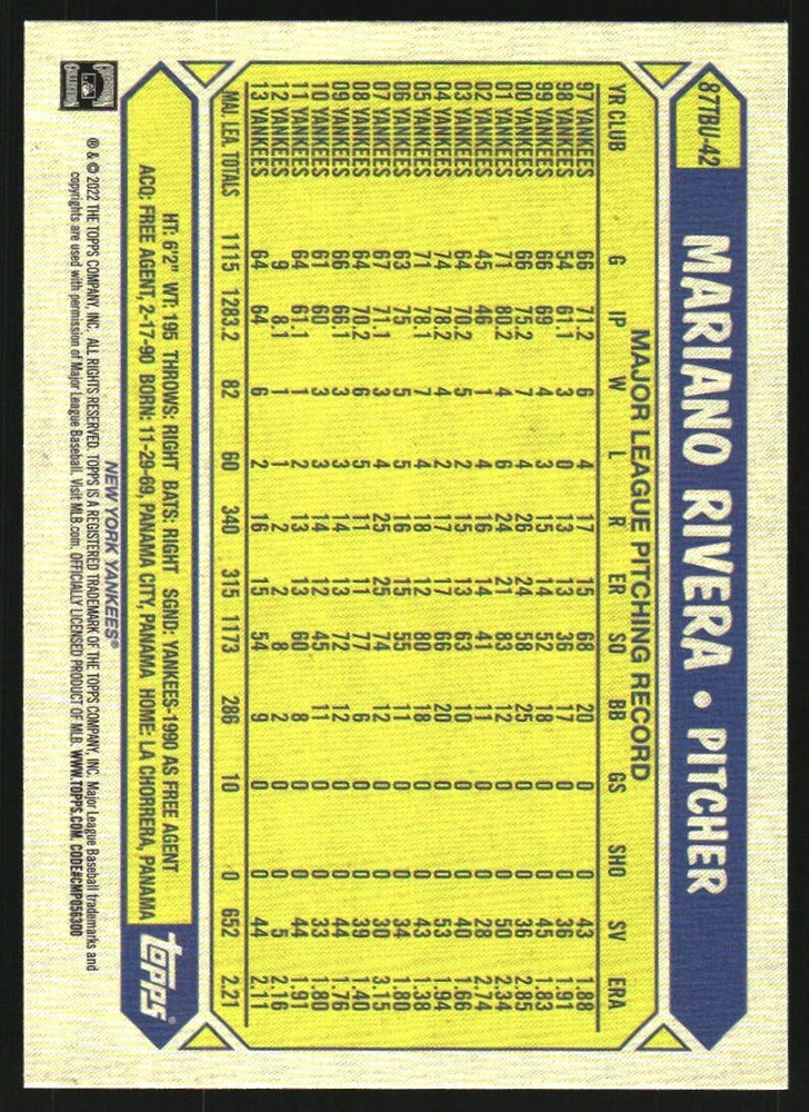 2022 Topps Update '87 Topps #87TBU42 Mariano Rivera Front Back Sport: Baseball Set: 2022 Topps Update '87 Topps Year: 2022 Item#: 87TBU42 Player: Mariano Rivera Team: New York Yankees Brand: Topps Update Manufacturer: Topps Co. Grading Company: Raw Grade SetType: Insert Item Condition: Near Mint/Mint 2014 Beckett Collectibles, LLC. All Rights Reserved Powered by: Thank you for choosing Burbank Sportscards, the sports cards superstore. We offer a large selection of singles across all sports. Visit our ebay store to view all our items available. Our Shipping Policy We offer Free Standard Shipping to all Domestic customers. Options for Expedited shipping are also available at checkout. For our international customers, shipping is $9.99 for the first item, and $0.25 for each additional item. Note to all customers: To qualify for combines shipping, we ask our customers to add items into the shopping cart. Please note, we do not combine orders that are placed separately. Our Service: Generally, our turnaround is super quick as we process and send out orders same day payment is received. Stock Availability: We do our best to ensure all items are in stock; however, in case of the rare stock out, the customer will have the option for a replacement card, or we will process a refund so the order is not held up. Our Images: Many of our images are stock photos from Beckett archives. They are a representation of the actual card you would receive. If you have any questions regarding the item you're interested in, please feel free to ask (serial numbers and relic pieces may vary) Moreover, in a case of a wrong or defective photo, please notify us, so we can adjust it. Other FAQ's: -When buying multiple cards, do you top load each item? No; however, we do try to insure all items are shipped securely. If you wish to have all of your cards top loaded it is a paid service and can be arranged. Please email for more details. For other questions, please feel free to ask. Thank you.