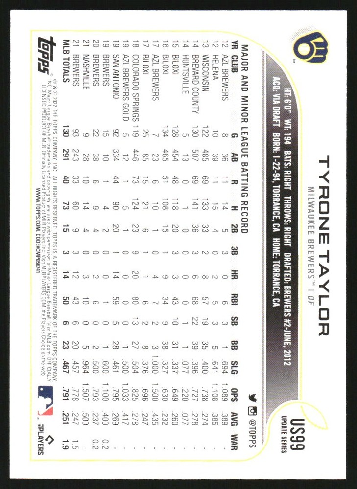2022 Topps Update Rainbow Foil #US99 Tyrone Taylor Front Back Sport: Baseball Set: 2022 Topps Update Rainbow Foil Year: 2022 Item#: US99 Player: Tyrone Taylor Team: Milwaukee Brewers Brand: Topps Update Manufacturer: Topps Co. Grading Company: Raw Grade SetType: Parallel Item Condition: Near Mint/Mint 2014 Beckett Collectibles, LLC. All Rights Reserved Powered by: Thank you for choosing Burbank Sportscards, the sports cards superstore. We offer a large selection of singles across all sports. Visit our ebay store to view all our items available. Our Shipping Policy We offer Free Standard Shipping to all Domestic customers. Options for Expedited shipping are also available at checkout. For our international customers, shipping is $9.99 for the first item, and $0.25 for each additional item. Note to all customers: To qualify for combines shipping, we ask our customers to add items into the shopping cart. Please note, we do not combine orders that are placed separately. Our Service: Generally, our turnaround is super quick as we process and send out orders same day payment is received. Stock Availability: We do our best to ensure all items are in stock; however, in case of the rare stock out, the customer will have the option for a replacement card, or we will process a refund so the order is not held up. Our Images: Many of our images are stock photos from Beckett archives. They are a representation of the actual card you would receive. If you have any questions regarding the item you're interested in, please feel free to ask (serial numbers and relic pieces may vary) Moreover, in a case of a wrong or defective photo, please notify us, so we can adjust it. Other FAQ's: -When buying multiple cards, do you top load each item? No; however, we do try to insure all items are shipped securely. If you wish to have all of your cards top loaded it is a paid service and can be arranged. Please email for more details. For other questions, please feel free to ask. Thank you.