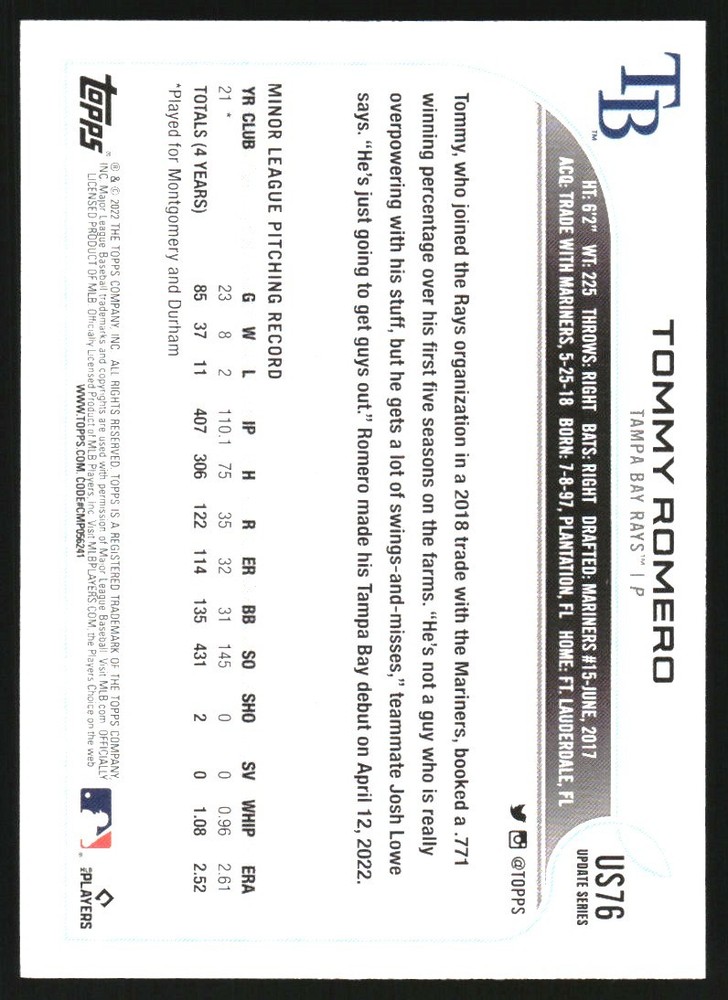 This 2022 Topps Update Rainbow Foil #US76 Tommy Romero card is a must-have for Rays fans and collectors! The vibrant rainbow foil finish makes it pop, and the near mint/mint condition ensures top quality. A great addition to any baseball card collection—especially for those chasing parallels. Love the sharp design and player focus—definitely worth adding to your lineup!