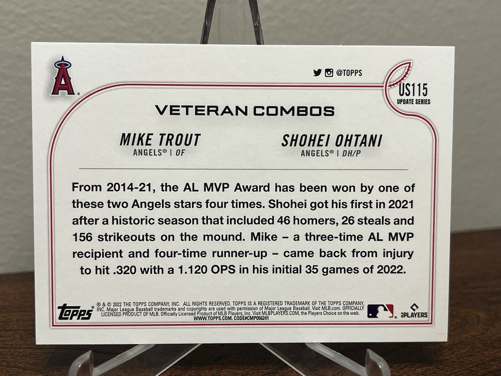Card Number:US115Season:2022Features:Short Print, Base Set, InsertGraded:NoParallel/Variety:RetailLeague:Major League Baseball (MLB)Year Manufactured:2022Autographed:NoVintage:NoSet:2022 Topps Update SeriesCard Condition:Near Mint or BetterPlayer/Athlete:Shohei Ohtani, Mike Trout, MVPSport:BaseballType:Sports Trading CardManufacturer:ToppsTeam:Los Angeles Angels