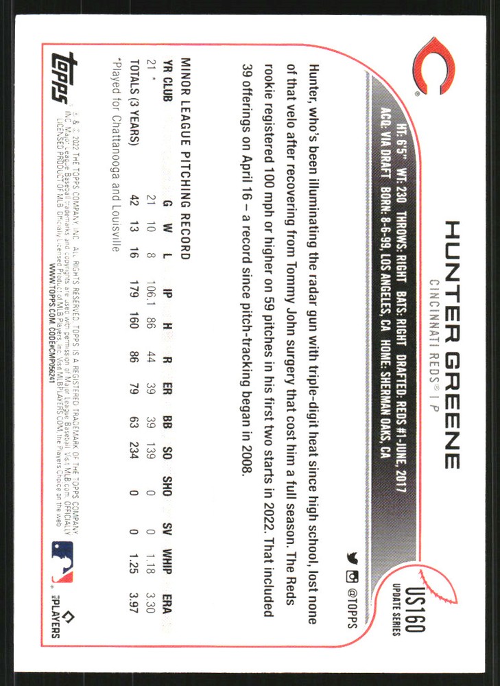 2022 Topps Update #US160 Hunter Greene Rookie Card Front Back Sport: Baseball Set: 2022 Topps Update Year: 2022 Item#: US160 Player: Hunter Greene Team: Cincinnati Reds Attributes: Rookie Brand: Topps Update Manufacturer: Topps Co. Grading Company: Raw Grade SetType: Main Item Condition: Near Mint/Mint 2014 Beckett Collectibles, LLC. All Rights Reserved Powered by: Thank you for choosing Burbank Sportscards, the sports cards superstore. We offer a large selection of singles across all sports. Visit our ebay store to view all our items available. Our Shipping Policy We offer Free Standard Shipping to all Domestic customers. Options for Expedited shipping are also available at checkout. For our international customers, shipping is $9.99 for the first item, and $0.25 for each additional item. Note to all customers: To qualify for combines shipping, we ask our customers to add items into the shopping cart. Please note, we do not combine orders that are placed separately. Our Service: Generally, our turnaround is super quick as we process and send out orders same day payment is received. Stock Availability: We do our best to ensure all items are in stock; however, in case of the rare stock out, the customer will have the option for a replacement card, or we will process a refund so the order is not held up. Our Images: Many of our images are stock photos from Beckett archives. They are a representation of the actual card you would receive. If you have any questions regarding the item you're interested in, please feel free to ask (serial numbers and relic pieces may vary) Moreover, in a case of a wrong or defective photo, please notify us, so we can adjust it. Other FAQ's: -When buying multiple cards, do you top load each item? No; however, we do try to insure all items are shipped securely. If you wish to have all of your cards top loaded it is a paid service and can be arranged. Please email for more details. For other questions, please feel free to ask. Thank you.