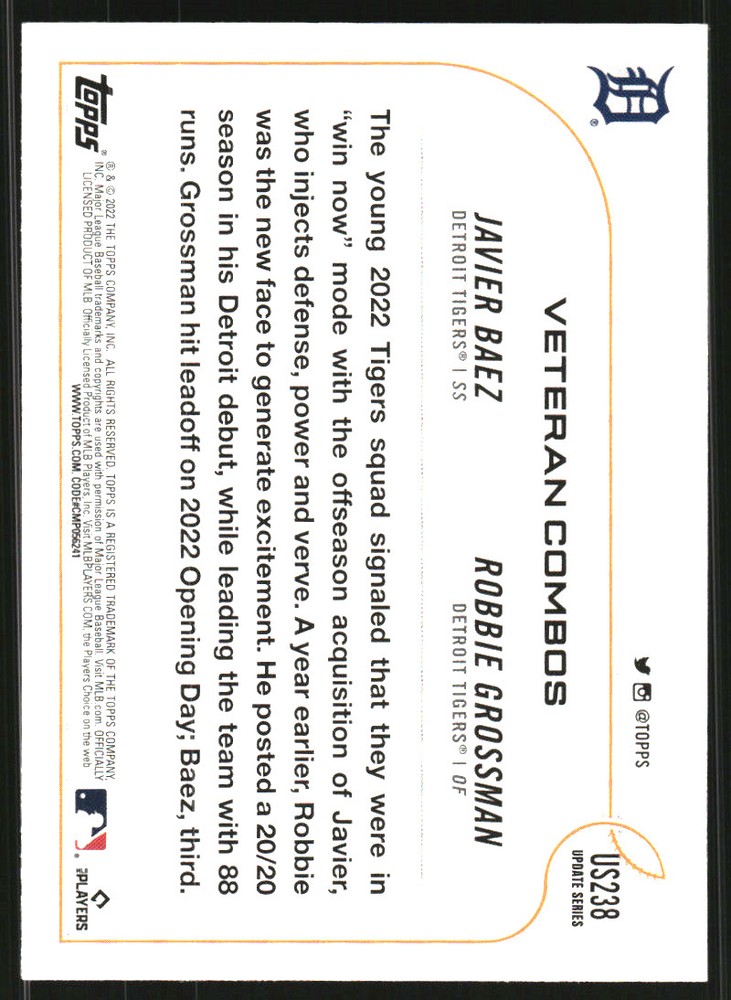 This card is a must-have for Tigers fans and collectors! The crisp design and sharp colors make the Baez/Grossman duo pop, and the near mint condition ensures it looks fantastic in any collection. A great addition to 2022 Topps Update sets—highly recommend grabbing one while you can! Burbank Sportscards delivers quality as always.
