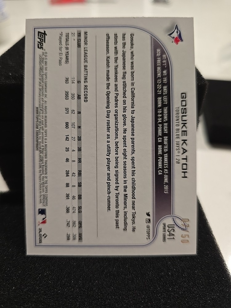 The product is a 2022 Topps Update Series trading card featuring Gosuke Katoh of the Toronto Blue Jays. This specific card is a Mother's Day Pink parallel with a limited print run of only 50. It is a standard-sized baseball card made of card stock, with English language text and manufactured by Topps in the United States. As a rookie card, it is serial numbered and considered a short print, making it a desirable collectible for fans and collectors alike.