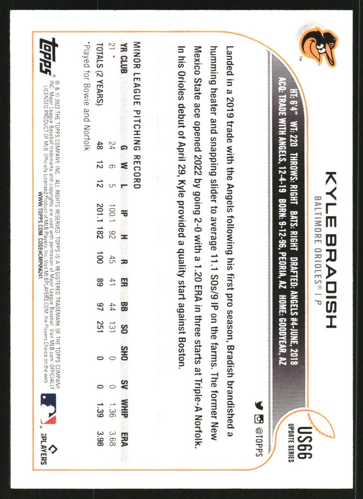 2022 Topps Update #US66 Kyle Bradish Rookie Card Front Back Sport: Baseball Set: 2022 Topps Update Year: 2022 Item#: US66 Player: Kyle Bradish Team: Baltimore Orioles Attributes: Rookie Brand: Topps Update Manufacturer: Topps Co. Grading Company: Raw Grade SetType: Main Item Condition: Near Mint/Mint 2014 Beckett Collectibles, LLC. All Rights Reserved Powered by: Thank you for choosing Burbank Sportscards, the sports cards superstore. We offer a large selection of singles across all sports. Visit our ebay store to view all our items available. Our Shipping Policy We offer Free Standard Shipping to all Domestic customers. Options for Expedited shipping are also available at checkout. For our international customers, shipping is $9.99 for the first item, and $0.25 for each additional item. Note to all customers: To qualify for combines shipping, we ask our customers to add items into the shopping cart. Please note, we do not combine orders that are placed separately. Our Service: Generally, our turnaround is super quick as we process and send out orders same day payment is received. Stock Availability: We do our best to ensure all items are in stock; however, in case of the rare stock out, the customer will have the option for a replacement card, or we will process a refund so the order is not held up. Our Images: Many of our images are stock photos from Beckett archives. They are a representation of the actual card you would receive. If you have any questions regarding the item you're interested in, please feel free to ask (serial numbers and relic pieces may vary) Moreover, in a case of a wrong or defective photo, please notify us, so we can adjust it. Other FAQ's: -When buying multiple cards, do you top load each item? No; however, we do try to insure all items are shipped securely. If you wish to have all of your cards top loaded it is a paid service and can be arranged. Please email for more details. For other questions, please feel free to ask. Thank you.