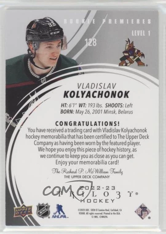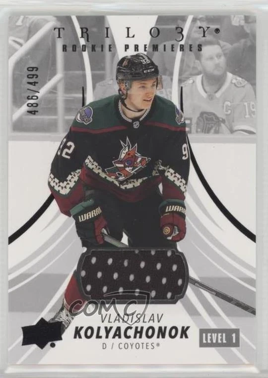 2022-23 Upper Deck Trilogy - [Base] - Black Foil Memorabilia #128 Common - Rookie Jersey - Vladislav Kolyachonok Qty Made: 499 - RC (Rookie Card) - Ice Hockey Card - Featuring the Arizona Coyotes - Featuring Vladislav Kolyachonok Search for more: 2022-23 Upper Deck Trilogy Search for more: 2022-23 Upper Deck Trilogy - [Base] - Black Foil Memorabilia View all of our Listings Auctions Buy It Now About Us Located in the beautiful Pacific Northwest, COMC (Check Out My Cards) is the world's largest consignment service for trading card singles. More than 10,000 people have used our consignment service to list over 50 million trading cards. We currently house 20 million cards, each listed for sale with front and back images of the actual card. Find out how we can help you consign your items on eBay by contacting us through eBay messaging. COMC -- "The Safe & Easy Way to Buy & Sell" Representative Image - Select Specific Item above to see image of actual item Representative Image - Select Specific Item above to see image of actual item Raw Condition for Modern Cards Unless otherwise noted, raw modern cards are listed in Near Mint-Mint condition or better. A NM-MT card appears to be Mint at first glance, but upon closer inspection, may exhibit some of the following: minor print defects (e.g. roller marks, print line, dimple), minor scratches, slight edge wear, and slight corner wear. Centering is clearly visible in the images provided and does not factor into our condition assessment. Raw Condition for Vintage Cards Unless otherwise noted, raw vintage cards are listed in Excellent condition or better. An EX card may exhibit some of the following: minor rounding of corners, surface wear, print defects, light scratches, and slight edge wear/chipping. Centering is clearly visible in the images provided and does not factor into our condition assessment. Domestic Shipping Combined shipping for multiple items is available. To receive combined shipping, please ensure all desired items are in your eBay shopping cart before proceeding to checkout. eBay limits orders to 40 items per order. We automatically combine multiple orders placed on the same day. If you place multiple orders on the same day, please contact us to request a refund of applicable shipping costs. Signature confirmation may be required on invoices over $400. Raw cards are shipped in toploaders. International Shipping COMC offers eBay's International Shipping (EIS) for international orders under $2,500* (see country exceptions below). All duties and import fees are paid at checkout; in the rare event that there are additional import fees upon delivery, these are borne by the buyer. EIS packages route through a shipping hub in Erlanger, KY before shipping to their final destination. Please note that EIS does not allow for combined shipments. The shipping rates are determined by eBay and cannot be adjusted. *Maximum sale price exceptions: Colombia, Kuwait ($2,000); Taiwan ($1,539); Chile, Costa Rica, Guatemala, Honduras, Trinidad and Tobago ($1,000); Antigua and Barbuda, Aruba, Belize, Dominica, Grenada, Philippines, Saint Kitts and Nevis, Saint Lucia, Montserrat, Turks and Caicos Islands ($500); Dominican Republic, El Salvador ($200). Please request a shipping quote through eBay messaging for orders that exceed the maximum sale price supported by eBay's International Shipping. You will be responsible for all duties and import fees for international orders shipped outside the EIS. Raw cards are shipped in toploaders. Payment COMC does not accept offers on our cards through our eBay storefront. COMC utilizes eBay’s managed payments system. If you are experiencing difficulties making a payment, please contact eBay for assistance. Return Policy Returns are only accepted on the rare occasion the item is not as described. If you are making a return, please initiate the return process through eBay so a mailing label can be provided for you. Prior to listing, our expert team carefully assessed this item to represent it accurately. Please review the description and high-definition images prior to purchasing to ensure this item meets your satisfaction. We welcome you to contact us if you have further questions about this item. Trust and Integrity COMC carefully assesses each item consigned to us to prevent fraudulent items from entering the marketplace. If you believe an item offered on COMC may be fraudulent, please contact us with details so we can investigate the issue. Items we determine are outside our supported items policy may be removed. Last Modified: 11/11/2024 11:55:10 AM PDT
