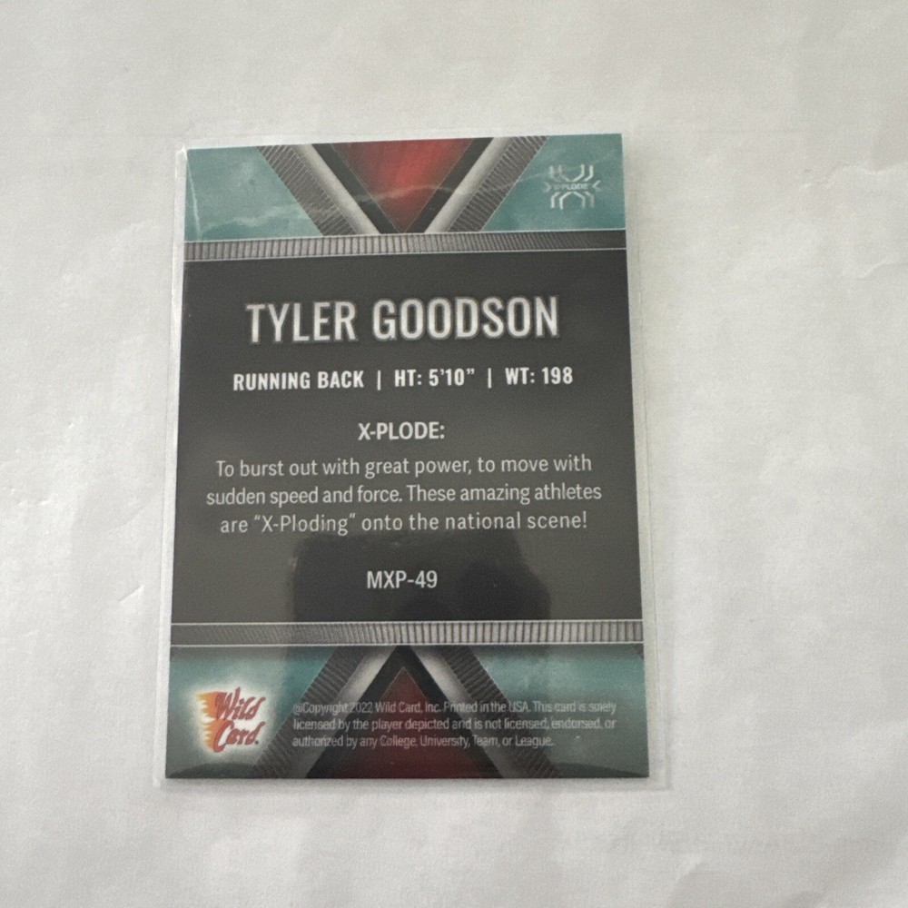 The 2022 Wild Card Matte Tyler Goodson MXP-49 X-close 57/75 Chase Card is a sports trading card featuring Tyler Goodson, a player in football. Manufactured in 2022 by Wild Card in the United States, the card is made of card stock and is serial numbered. It is part of the 2022 Wild Card Matte set and is in excellent condition, though ungraded. With a limited production of 75 cards in this chase series, it appeals to collectors of sports memorabilia and trading cards.