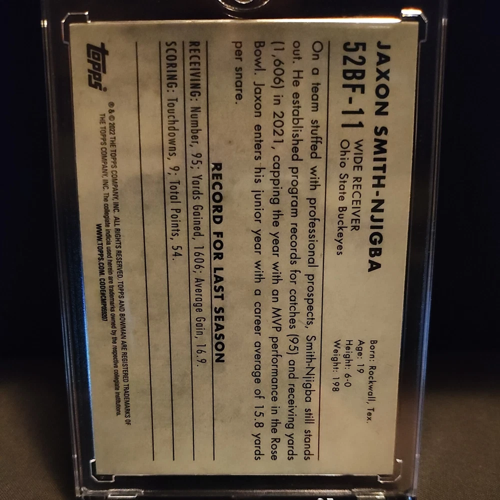 For the avid sports fans and collectors out there, we present to you a rare opportunity to get your hands on a 2022 Topps Chrome trading card featuring Jaxon Smith-Njigba, a rising star in the football world. This card is a refractor parallel/variety, and is ungraded but in excellent shape, making it a great addition to any collection. The card is from the Ohio State Buckeyes team and features the rookie athlete in his college uniform. It is part of a larger set and has a card number of 52BF-11. This card is perfect for those looking to complete their collection or for those who are simply fans of Jaxon Smith-Njigba. Don't miss out on this opportunity to add a piece of sports history to your collection.