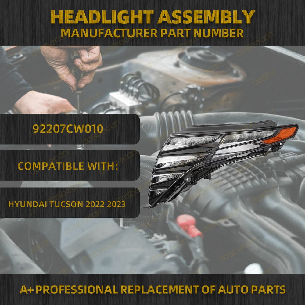 Features & details 【Compatible With】 2022-2023 Hyundai Tucson 【Manufacture Part Number】 92207CW010, 92207-CW010, HY2562114 【 Specifications 】 Condition: 100% New Material: ABS, PP, PC Lens Color: Clear Housing Color: original style Light Color: White Lighting Source: LED (Included) Placement on Vehicle: Left Driver Side Way of Use: Direct Replacement Assembly Method: Closed warranty: 1 Year 【Advantages 】 Designed and manufactured exactly as stock unit to ensure perfect fit. DOT compliant & built to high quality standard,Well-finished to prolong the service time of the item. Made of high quality ABS plastic with light weight & super durability. Adding a fancy touch to your vehicle's appearance. All items rigorously tested To ensure structural strength. 【Package Includes】 1x Left Driver Side Headlight ( As picture shows) 【Service & Warranty】 Purchase from DASBECAN, enjoy 1 year no worries-warranty, whenever you met issue when installing or using, please contact us via eBay Message, and we will reply within 24 hours and help solve the problem. 100% Brand new OE Specification Premium Quality aftermarket parts! 1 Year warranty, long durable life! Direct fit, no modification requires, easy installation! High-quality Materials: This product is made of PP and PC with an injection molding process, making it sturdy and impact-resistant, so it can be used for a long time. Eco-friendly & Safe: The energy-saving, environmentally friendly, and bright LED light source can alert oncoming traffic on rainy, snowy, and foggy days, increasing safety while driving. Customer Question & Answers Q1: Will This Part Fit My Vehicle? We list all the compatiblity, if your vehicle does not show up on the compatibility table at the top of our listings, welcome you to contact us for free consulation before purchasing a product. Q2: Does they come with warranty? All of our product comes with 1-year warranty, but some times you need to pay the shipping fee. Q3: How to use it? If you don't know how to install this accessory, welcome to contact us, we will provide you with a video guide. Payment Shipping Warranty & Service Returns/Exchanges Contact us Payment Most of the payment methods are available, such as Paypal, Payoneer, Credit Card. Within 1 day of receiving your payment, we will start processing your order. Shipping All Items Will Be Ship Within 1working Days, and We Will Ship out All Orders As Soon As Possible After Payment Verified, Please Allow up to 1-6 Business Days for Delivery. Why Choose the Us Stock? 1. Us Local Shipping, No Extra Customs Cost. 2. Fast Delivery: 1-6 Working Days Delivery. Warranty & Service All the product in our store come with a 1-year-warranty. If there is a problem with the product you purchased within 1 year, please contact us, we will provide you with after-sale protection. Our job is not complete until each customer is satisfied! Receiving positive feedback is extremely important to us. We give all our buyers positive feedback as soon as payment is received Negative feedback and bad ratings do not solve the problem! If you contact us via eBay, we will be more than happy to work with you! Returns/Exchanges If you received an incorrect, damaged, defective, or item not as described , contact us for a partial/full refund or replacement on our costs. If we shipped you the wrong part, we pay for the return shipment and send you the correct part. If you ordered the wrong part, contact us for a return address and simply return it,give us a tracking number. We will send you the new item as soon as the returned package is received; If you simply don't want the part, ship it back and give us a tracking number. After we receive the item, we will refund the item price minus shipping costs. All returns must be done within 30 days after receiving the package. Parts must be new and unused in the original condition: including box, packaging and all other accessories,or we will charge you a partial costs. Contact us If you encounter any problems during purchase or use, please contact us via eBay message directly. On May 19, 2025 at 18:52:11 PDT, seller added the following information: