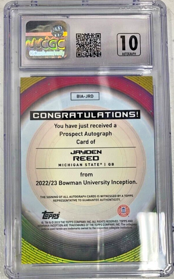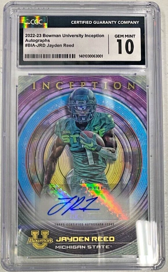 Set: 2022-23 Bowman Inception University Card Number: BIA-JRD Features: Rookie, Insert Autographed: Yes Series: Bowman Inception University League: National Collegiate Athletic Association (NCAA) Player/Athlete: Jayden Reed Insert Set: Autographs Manufacturer: Topps Team: Michigan State Spartans Sport: Football Season: 2022-23 brand: Topps