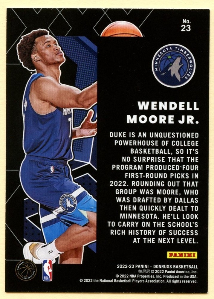 2022-23 Panini Donruss Basketball Wendell Moore Jr. Great X-Pectations Rookie card insert #23. Minnesota Timberwolves See photos for detail. The card shown in the images is the one you will receive. Free shipping via eBay ESE (eBay standard envelope). Single card orders will ship in top loader or card saver. Multiple card orders will ship in card savers.