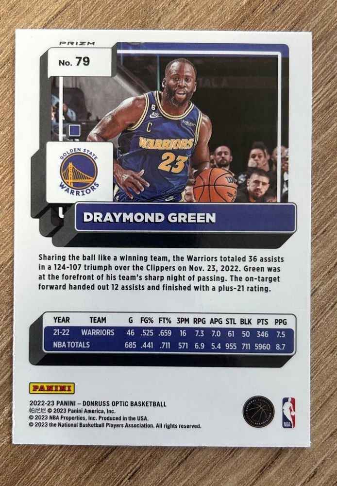 Elevate your basketball card collection with the 2022-23 Donruss Optic #79 featuring the versatile Draymond Green of the Golden State Warriors. This Choice Red Green variety card is a standout piece, highlighting Green's dynamic presence on the court. The card is part of the Choice Red & Green insert set, known for its eye-catching design and collectibility. Crafted by Donruss, a trusted name in sports card manufacturing, this card captures the essence of the NBA season with its vibrant colors and premium finish. It's a must-have for fans of the sport or collectors seeking to commemorate Green's contribution to basketball. Please note that the card is not autographed.