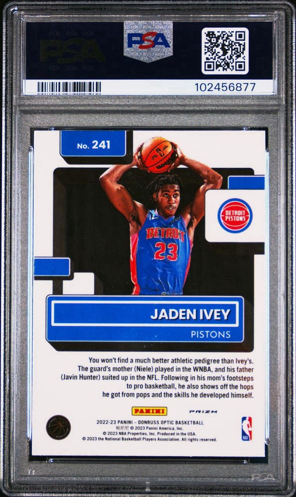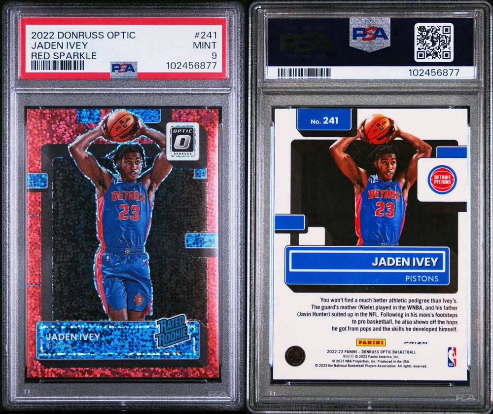 Elevate your basketball card collection with the 2022-23 Donruss Optic #241 Jaden Ivey Red Sparkle Rookie card. This eye-catching piece features the promising talent of Jaden Ivey, captured in the iconic Rated Rookie design set against the shimmering Red Sparkle parallel that makes it a standout addition. Crafted by Panini, a trusted name in sports memorabilia, this card belongs to the esteemed 2022 Panini Donruss Optic series and represents Ivey's rookie season with the Detroit Pistons. As a non-autographed treasure, it shines a spotlight on the athlete's early career in the NBA, making it a must-have for enthusiasts and fans alike.