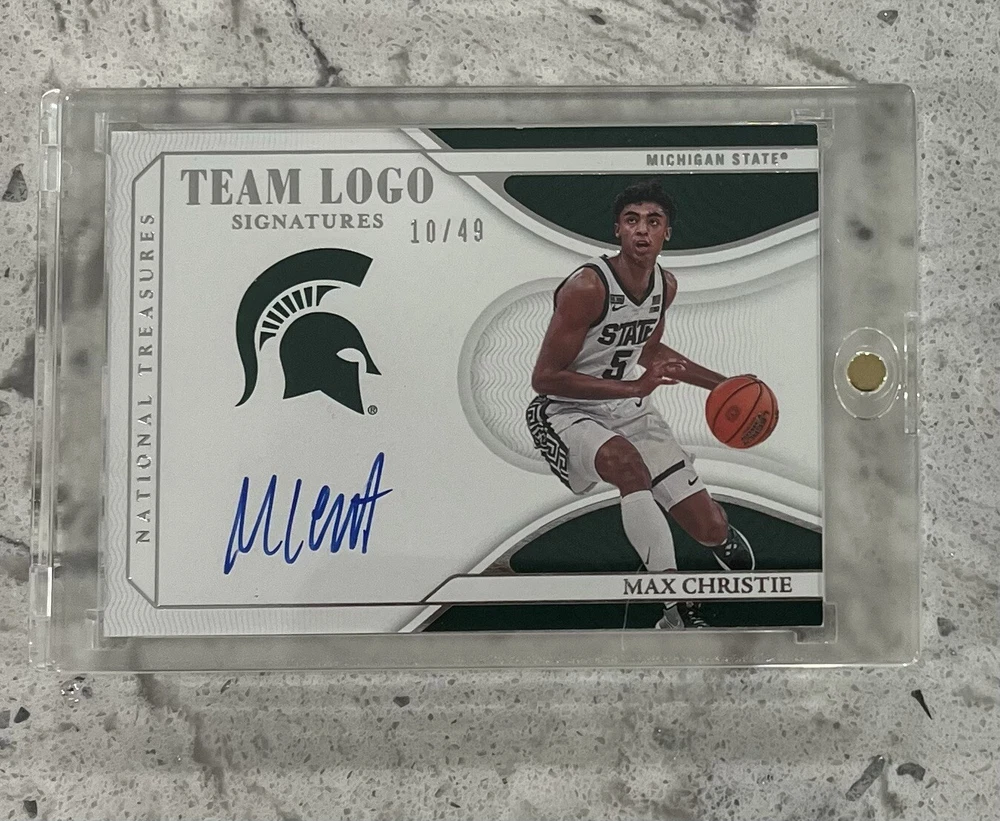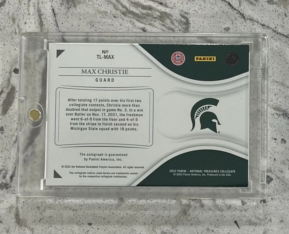 Parallel/Variety:VarietyAutographed:YesTeam:Los Angeles Lakers, Michigan State SpartansCard Size:StandardSport:BasketballCard Manufacturer:ManCard Number:TL-MAXSeason:2022-23Type:Sports Trading CardPlayer/Athlete:Max ChristieOriginal/Licensed Reprint:OriginalPlayer:PlayerCountry/Region of Manufacture:UnknownLeague:National Basketball Association (NBA)Set:2022-23 Panini National Treasures CollegiateFeatures:InsertManufacturer:PaniniMaterial:Card Stock