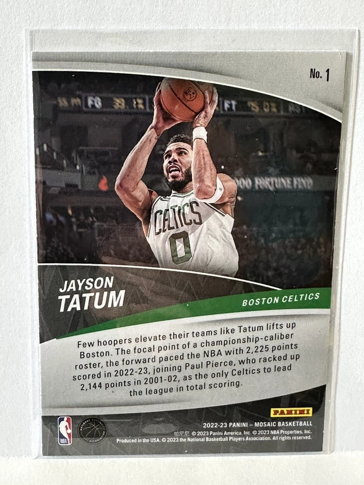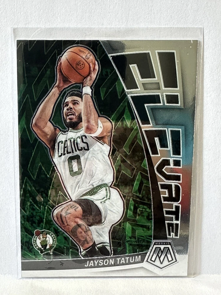 This rare and highly sought-after 2022-23 Panini Mosaic sports trading card features the talented Boston Celtics athlete, Jayson Tatum, and is part of the exclusive Elevate insert set. The card is a stunning parallel/variety of the Mosaic series and is numbered 1 in the set. It's perfect for basketball fans and collectors alike, and is an excellent addition to any sports memorabilia collection. This card is manufactured by Panini and features Tatum in his 2022-23 season, making it a must-have for any fan of the National Basketball Association (NBA).