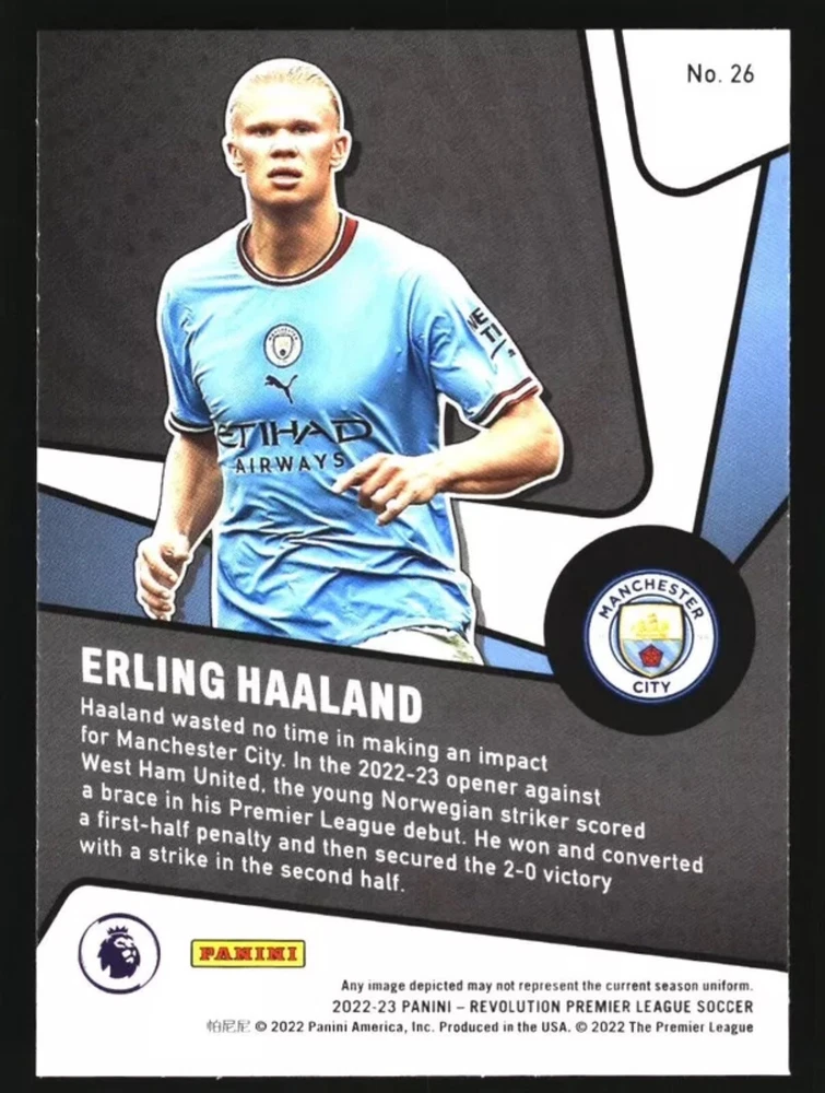 This listing features a 2022-23 Panini Revolution Premier League trading card of Erling Haaland, a talented soccer player from Manchester City. The card is part of the Supersonic parallel/variety and has a card number of 26. It is in near mint or better condition, making it a valuable addition to any sports trading card collection. The card also includes features from Panini, a well-known manufacturer of sports trading cards. This particular card is from the 2022 season and is a must-have for any fan of the Premier League or Erling Haaland. Don't miss out on the opportunity to own this rare and highly sought-after card.