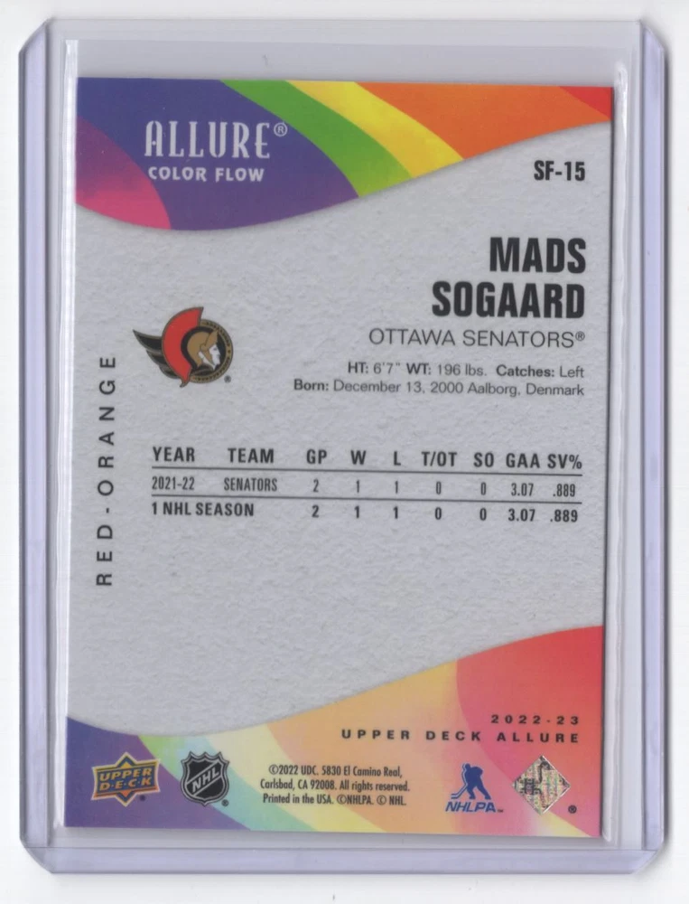 Graded: No Card Number: SF-15 Manufacturer: Upper Deck Allure Color Flow Team: Ottawa Senators Character: Mads Sogaard Card Name: 2022-23 Red-Orange SP Mads Sogaard Ottawa Senators #SF-15 Card Size: 4" x 3" Set: Upper Deck Allure Color Flow Red-Orange SP Year Manufactured: 2022 Vintage: No Autographed: No Season: 2022 Franchise: Hockey Player/Athlete: Mads Sogaard Type: Sports Trading Card Game: Unspecified Original/Licensed Reprint: Original Sport: Hockey