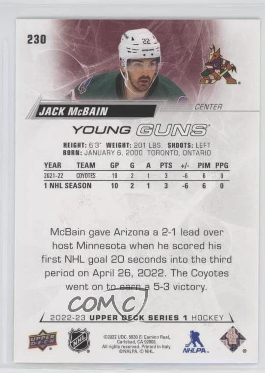 2022-23 Upper Deck Series 1 - [Base] - Silver Foil #230 Young Guns - Jack McBain - RC (Rookie Card) - Ice Hockey Card - Featuring the Arizona Coyotes - Featuring Jack McBain Search for more: 2022-23 Upper Deck Series 1 Search for more: 2022-23 Upper Deck Series 1 - [Base] - Silver Foil View all of our Listings Auctions Buy It Now About Us Located in the beautiful Pacific Northwest, COMC (Check Out My Cards) is the world's largest consignment service for trading card singles. More than 10,000 people have used our consignment service to list over 50 million trading cards. We currently house 20 million cards, each listed for sale with front and back images of the actual card. Find out how we can help you consign your items on eBay by contacting us through eBay messaging. COMC -- "The Safe & Easy Way to Buy & Sell" Representative Image - Select Specific Item above to see image of actual item Representative Image - Select Specific Item above to see image of actual item Raw Condition for Modern Cards Unless otherwise noted, raw modern cards are listed in Near Mint-Mint condition or better. A NM-MT card appears to be Mint at first glance, but upon closer inspection, may exhibit some of the following: minor print defects (e.g. roller marks, print line, dimple), minor scratches, slight edge wear, and slight corner wear. Centering is clearly visible in the images provided and does not factor into our condition assessment. Raw Condition for Vintage Cards Unless otherwise noted, raw vintage cards are listed in Excellent condition or better. An EX card may exhibit some of the following: minor rounding of corners, surface wear, print defects, light scratches, and slight edge wear/chipping. Centering is clearly visible in the images provided and does not factor into our condition assessment. Domestic Shipping Combined shipping for multiple items is available. To receive combined shipping, please ensure all desired items are in your eBay shopping cart before proceeding to checkout. eBay limits orders to 40 items per order. We automatically combine multiple orders placed on the same day. If you place multiple orders on the same day, please contact us to request a refund of applicable shipping costs. Signature confirmation may be required on invoices over $400. Raw cards are shipped in toploaders. International Shipping COMC offers eBay's International Shipping (EIS) for international orders under $2,500* (see country exceptions below). All duties and import fees are paid at checkout; in the rare event that there are additional import fees upon delivery, these are borne by the buyer. EIS packages route through a shipping hub in Erlanger, KY before shipping to their final destination. Please note that EIS does not allow for combined shipments. The shipping rates are determined by eBay and cannot be adjusted. *Maximum sale price exceptions: Colombia, Kuwait ($2,000); Taiwan ($1,539); Chile, Costa Rica, Guatemala, Honduras, Trinidad and Tobago ($1,000); Antigua and Barbuda, Aruba, Belize, Dominica, Grenada, Philippines, Saint Kitts and Nevis, Saint Lucia, Montserrat, Turks and Caicos Islands ($500); Dominican Republic, El Salvador ($200). Please request a shipping quote through eBay messaging for orders that exceed the maximum sale price supported by eBay's International Shipping. You will be responsible for all duties and import fees for international orders shipped outside the EIS. Raw cards are shipped in toploaders. Payment COMC does not accept offers on our cards through our eBay storefront. COMC utilizes eBay’s managed payments system. If you are experiencing difficulties making a payment, please contact eBay for assistance. Return Policy Returns are only accepted on the rare occasion the item is not as described. If you are making a return, please initiate the return process through eBay so a mailing label can be provided for you. Prior to listing, our expert team carefully assessed this item to represent it accurately. Please review the description and high-definition images prior to purchasing to ensure this item meets your satisfaction. We welcome you to contact us if you have further questions about this item. Trust and Integrity COMC carefully assesses each item consigned to us to prevent fraudulent items from entering the marketplace. If you believe an item offered on COMC may be fraudulent, please contact us with details so we can investigate the issue. Items we determine are outside our supported items policy may be removed. Last Modified: 11/30/2024 10:28:05 PM PDT