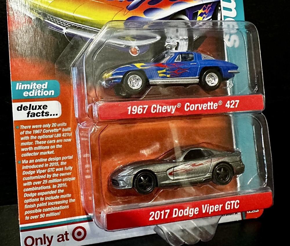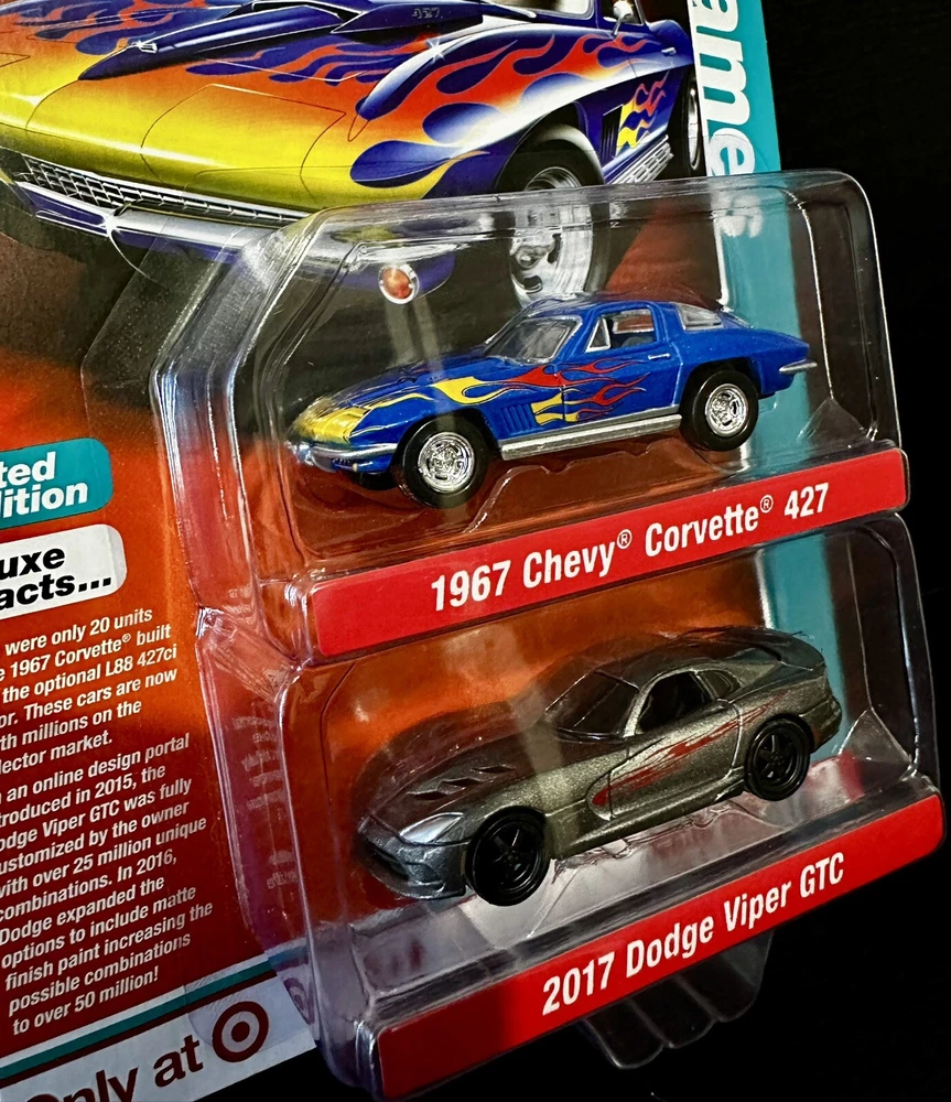 This 2 pack set from Auto World's Auto Drivers series features two iconic cars from the Corvette family. The 1967 Chevy Corvette 427 and 2017 Dodge Viper GTC are both beautifully crafted in 1:64 scale with multi-color paint jobs. These limited edition diecast cars come in an unopened box and are perfect for collectors or fans of the Corvette family. The set is recommended for ages 14 and up and was manufactured in China.