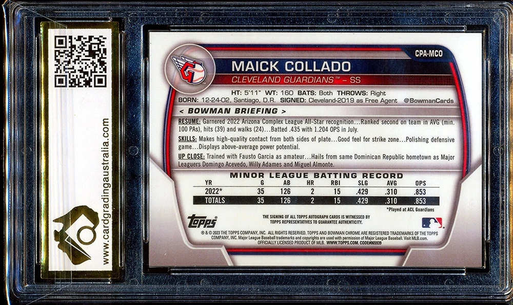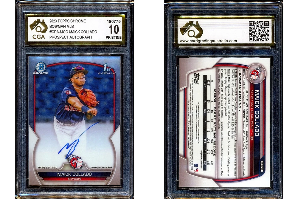 2023 Bowman Chrome Prospect Autographs #CPA-MCO Maick Collado CGA 10 An original high-grade example professionally graded by Card Grading Australia. Category: Sports Trading Cards - Baseball (MLB). Year: 2023. Grades: 10 PRISTINE (Pristine). Product ID: 180775. This Card is Independently graded by Card Grading Australia (CGA) and as such is covered by the CGA guarantee as to grade and authenticity. Accept no substitutes . "Photos are of the actual card(s) you are purchasing and will receive. " YES, WE DO COMBINE POSTAGE FOR MULTIPLE PURCHASES . We are very happy to combine multiple items to save on postage. If you are purchasing multiple items, please wait for a combined invoice with combined postage costs before paying. All raw ungraded cards come with penny-sleeve and top-loader; all graded cards come as pictured . Each item purchased from us comes with a lifetime guarantee of authenticity. Items can be returned for any reason within 30 days of receipt for a full refund as long as the item is in the same condition and packaging as when purchased. Any item can be returned without time limit if authenticity is suspect, as long as the item is in the same condition and packaging as when purchased. Proof of purchase will be required along with detailed description and/or photographs of the fault or issue with the product. We are a registered business ABN 86 412 009 454 . A Tax Invoice showing all our business details will be supplied with all purchases. Visit My eBay Store Add me to your Favorite Sellers View My Other Items for Sale