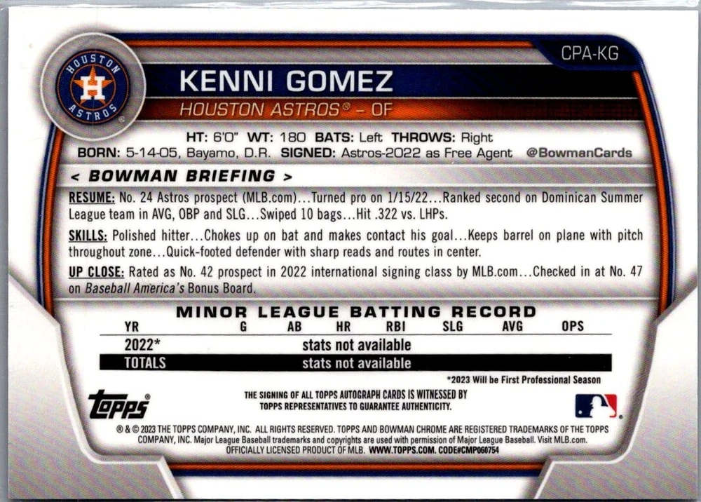 Card Number: CPA-KG League: Major League Baseball (MLB) Manufacturer: Topps Type: Sports Trading Card Player/Athlete: Kenni Gomez Team: Houston Astros Season: 2023 Insert Set: Prospect Autographs Parallel/Variety: Purple Refractor Set: 2023 Bowman Chrome Features: Serial Numbered, Parallel/Variety, Rookie, Insert Print Run: 250 Sport: Baseball