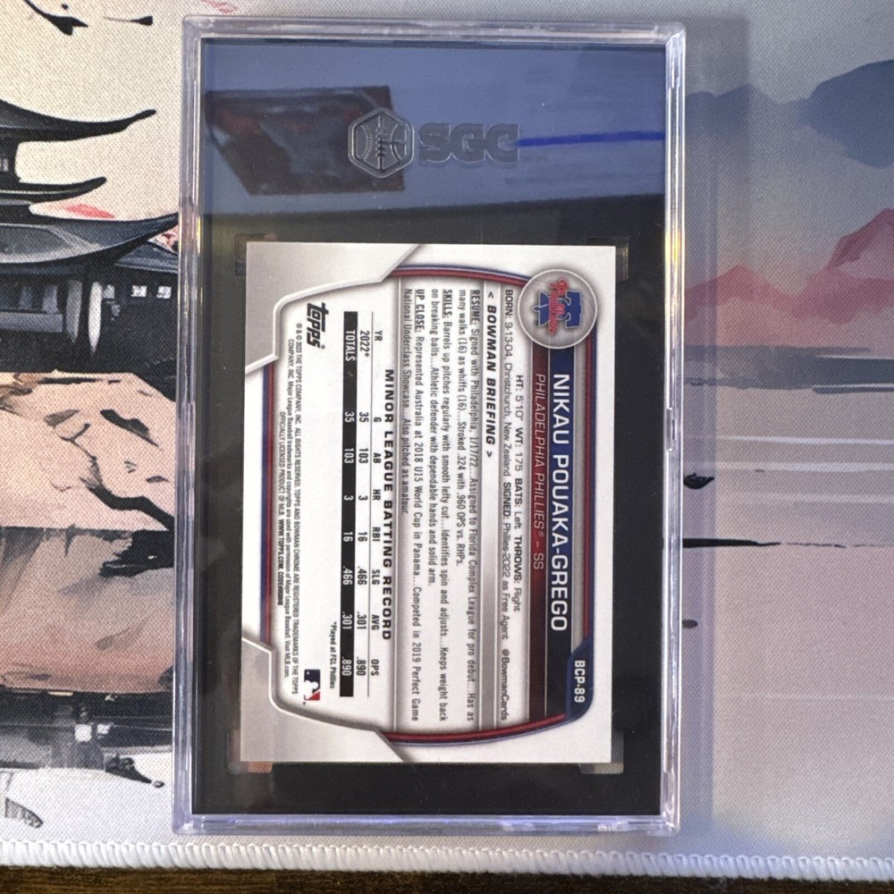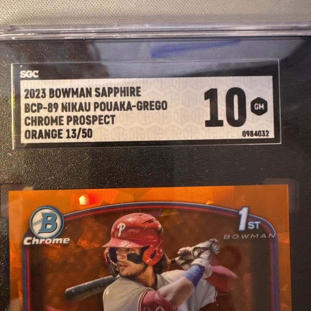 Capture the essence of baseball's future with the 2023 Bowman Chrome Draft Sapphire Prospects Orange Nikau Pouaka-Gredo card, a sought-after collectible for fans and investors alike. Serial numbered to ensure uniqueness, this card features the promising talent of Nikau Pouaka-Grego, of the Philadelphia Phillies, encapsulated in pristine detail by the Topps Co. Graded a perfect 10 by the Sportscard Guaranty Corporation (SGC), this single card is a testament to quality and craftsmanship. A modern-era gem from the 2023 collection, it's an original piece that celebrates the spirit of the sport and the potential of a rising star.