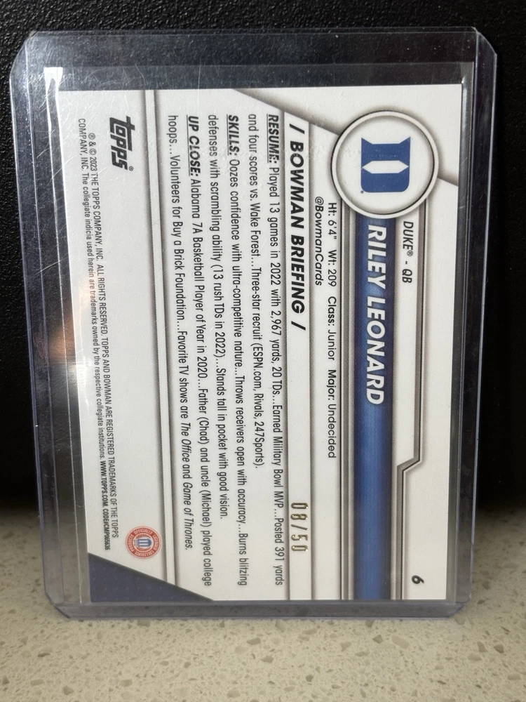 Elevate your sports trading card collection with the 2023 Bowman Chrome Sapphire University Riley Leonard Gold /50 #6. This exclusive card showcases the talent of Riley Leonard, captured in the vibrant Gold Sapphire parallel that shines amongst others. A must-have for football enthusiasts and collectors alike, it represents a piece of sports history from the Duke University standout. Expertly crafted by Bowman, the renowned manufacturer, this card is part of the highly sought-after 2023 Bowman Chrome Sapphire University set. Its limited gold variant adds an extra layer of rarity and desirability, making it a prized possession for those who appreciate the blend of athleticism and artistry.