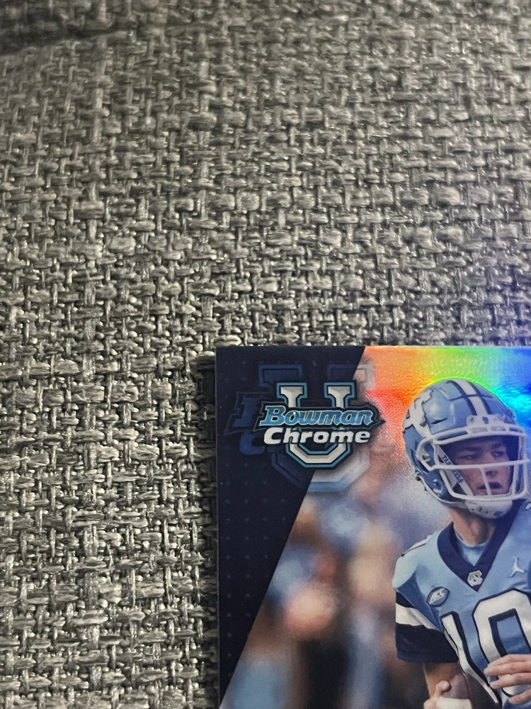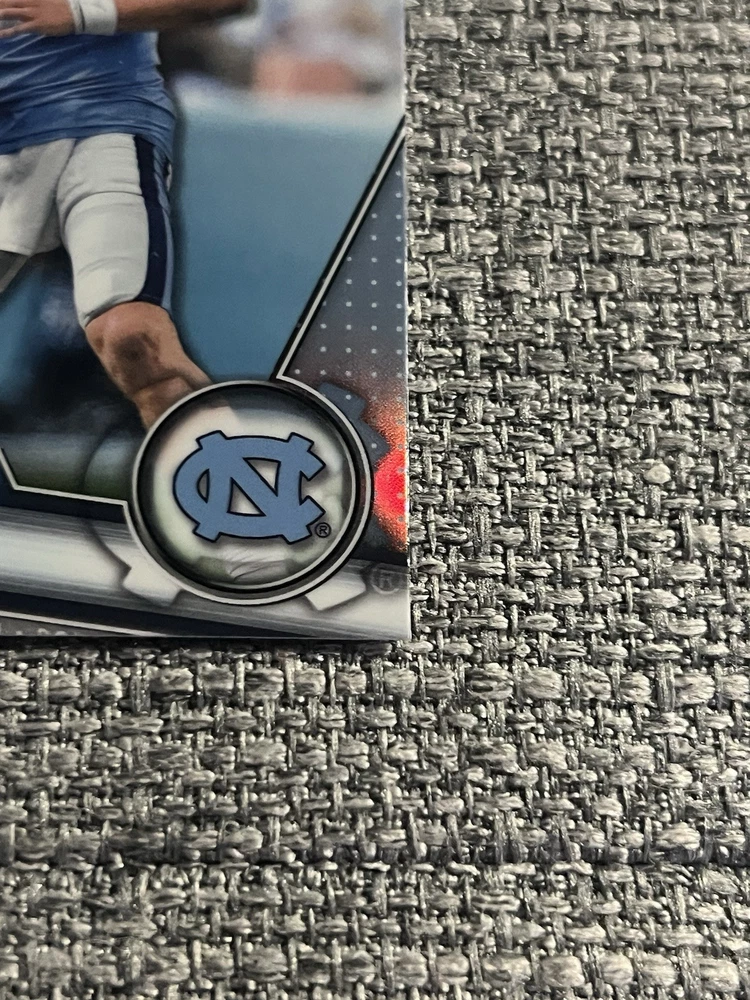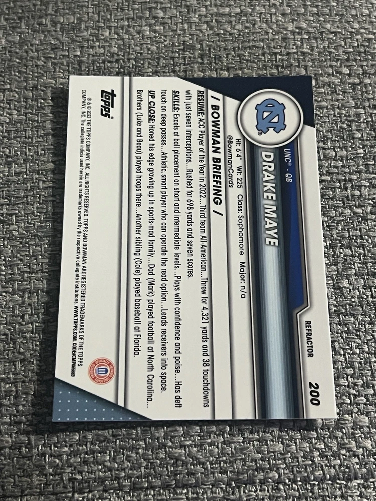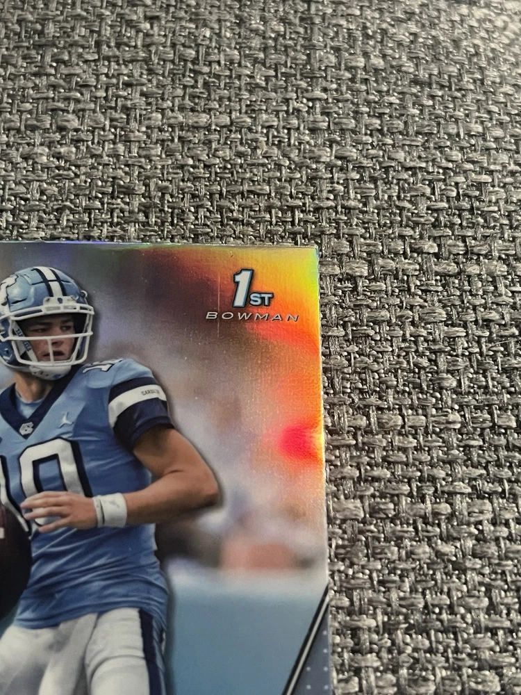 This is a 2023 Bowman Chrome University 1st Bowman Drake Maye Refractor sports trading card featuring player Drake Maye from the North Carolina Tar Heels football team. The card is part of the 2023 Bowman set, manufactured by Bowman. It is a Chrome Refractor parallel variety, made of card stock and in excellent condition. The card is an original licensed reprint and includes features like being from the base set and being a rookie 1st edition.