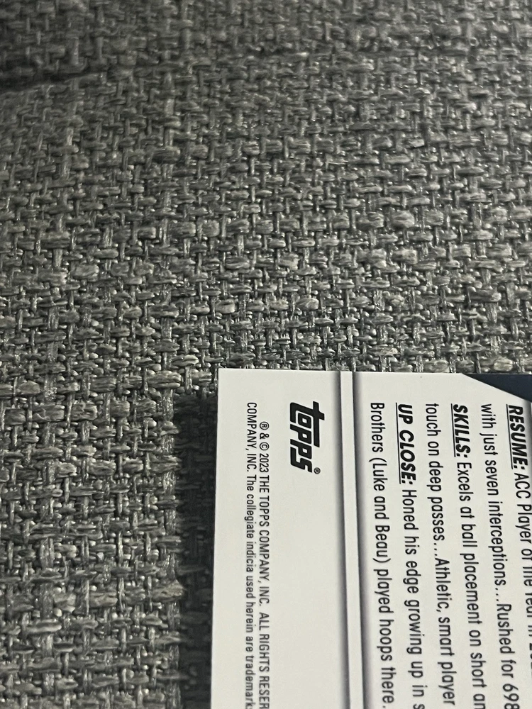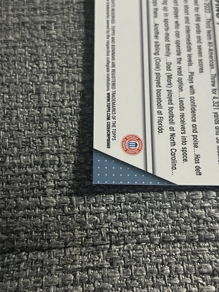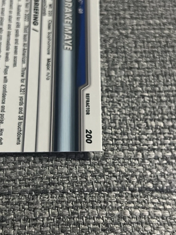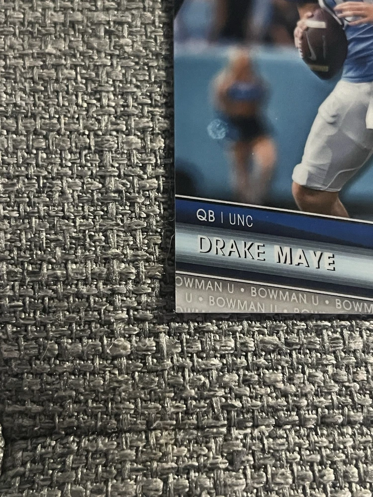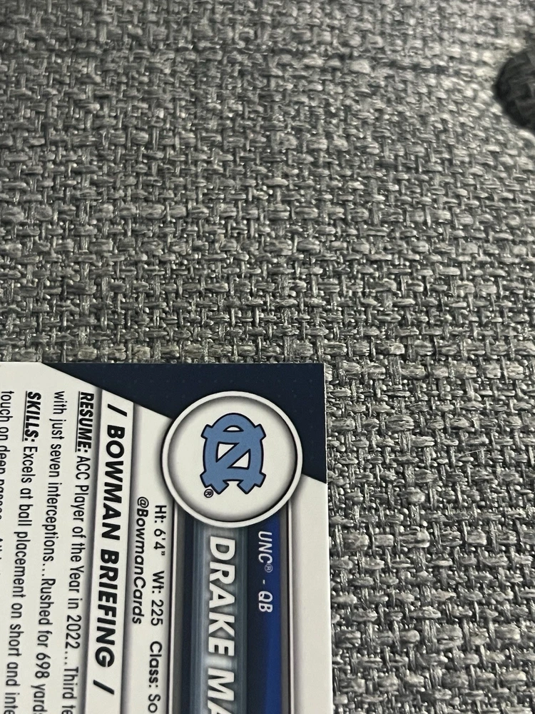 This is a 2023 Bowman Chrome University 1st Bowman Drake Maye Refractor sports trading card featuring player Drake Maye from the North Carolina Tar Heels football team. The card is part of the 2023 Bowman set, manufactured by Bowman. It is a Chrome Refractor parallel variety, made of card stock and in excellent condition. The card is an original licensed reprint and includes features like being from the base set and being a rookie 1st edition.