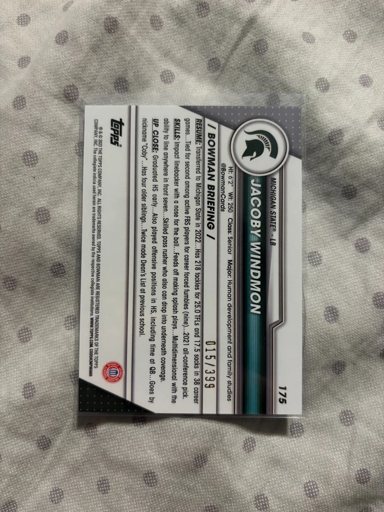 Year Manufactured:2023Card Size:StandardMaterial:Card StockTeam:Michigan State SpartansParallel/Variety:Purple RefractorLeague:National Collegiate Athletic Association (NCAA), National Football League (NFL)Country/Region of Manufacture:United StatesManufacturer:ToppsOriginal/Licensed Reprint:OriginalSet:2023 Bowman University ChromeType:Sports Trading CardAutographed:NoFeatures:Rookie, Serial NumberedSeason:2023Player/Athlete:Jacoby WindmonVintage:NoSport:Football