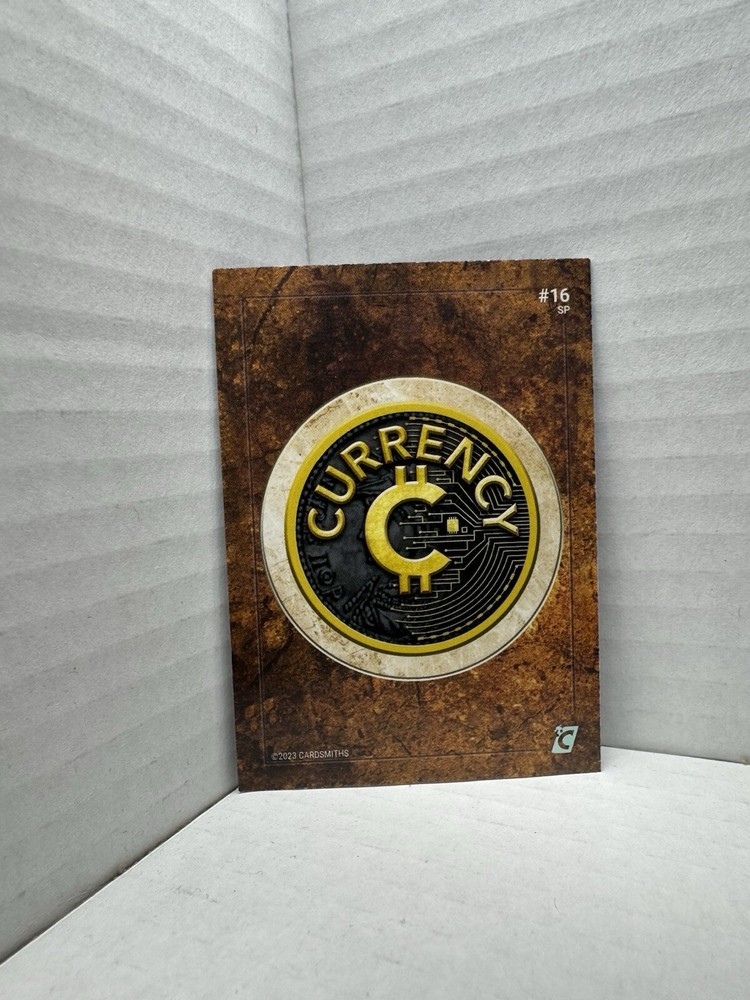 This 2023 Cardsmiths Currency Series 2 Base Blue Diamond #16-Sp trading card features a stunning design with a blue and silver color scheme. The card is made of high-quality card stock and is an original, licensed reprint from Cardsmiths. It is a non-sport trading card that is part of the Currency franchise, and it depicts various characters such as Cryptocurrency, Bitcoin, Ethereum, and Dogecoin. The card is a chase card, short print, and features a collector parallel Iced Foil, Holofoil, and Insert. It is an exclusive item that is perfect for collectors of all ages, especially those aged 16 and up.